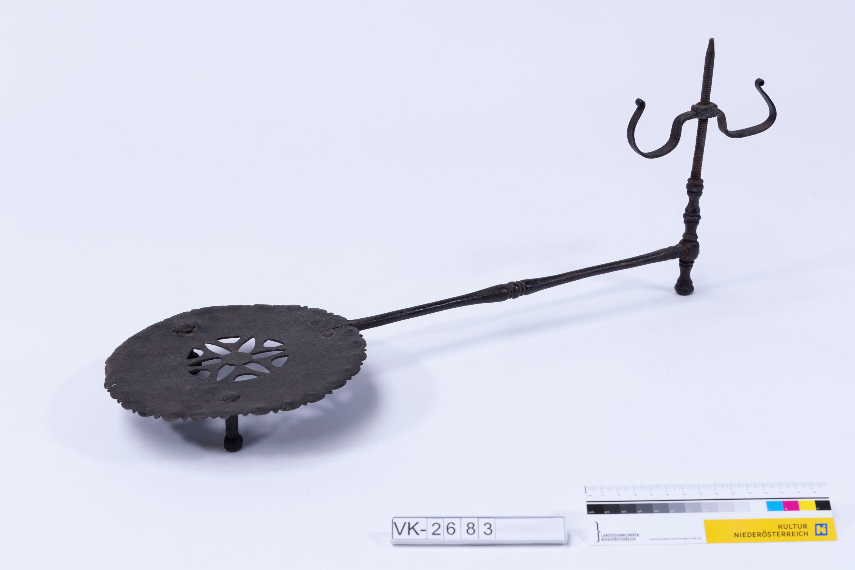 Pfannenuntersetzer (Pfannenknecht) mit runder Auflage, deren Kante im Bogen- und Zackenmuster beschnitten ist und deren Mitte mit einem ausgeschnittenen Muster verziert ist. Der Pfannenknecht hat einen Stiel und eine Stütze mit einem Doppelhaken an einer Gewindestange, zusätzlich zwei Füße unter der Auflage.