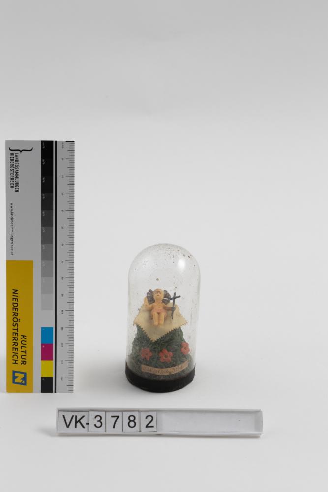 Kleiner Glassturz auf einem schwarzen Kartonsockel, darin eine Wachsfigur mit Messingblechelementen (Jesuskind auf Decke mit Kreuz), darunter ein bedruckter Papierstreifen: "Schlafendes Jesukind".