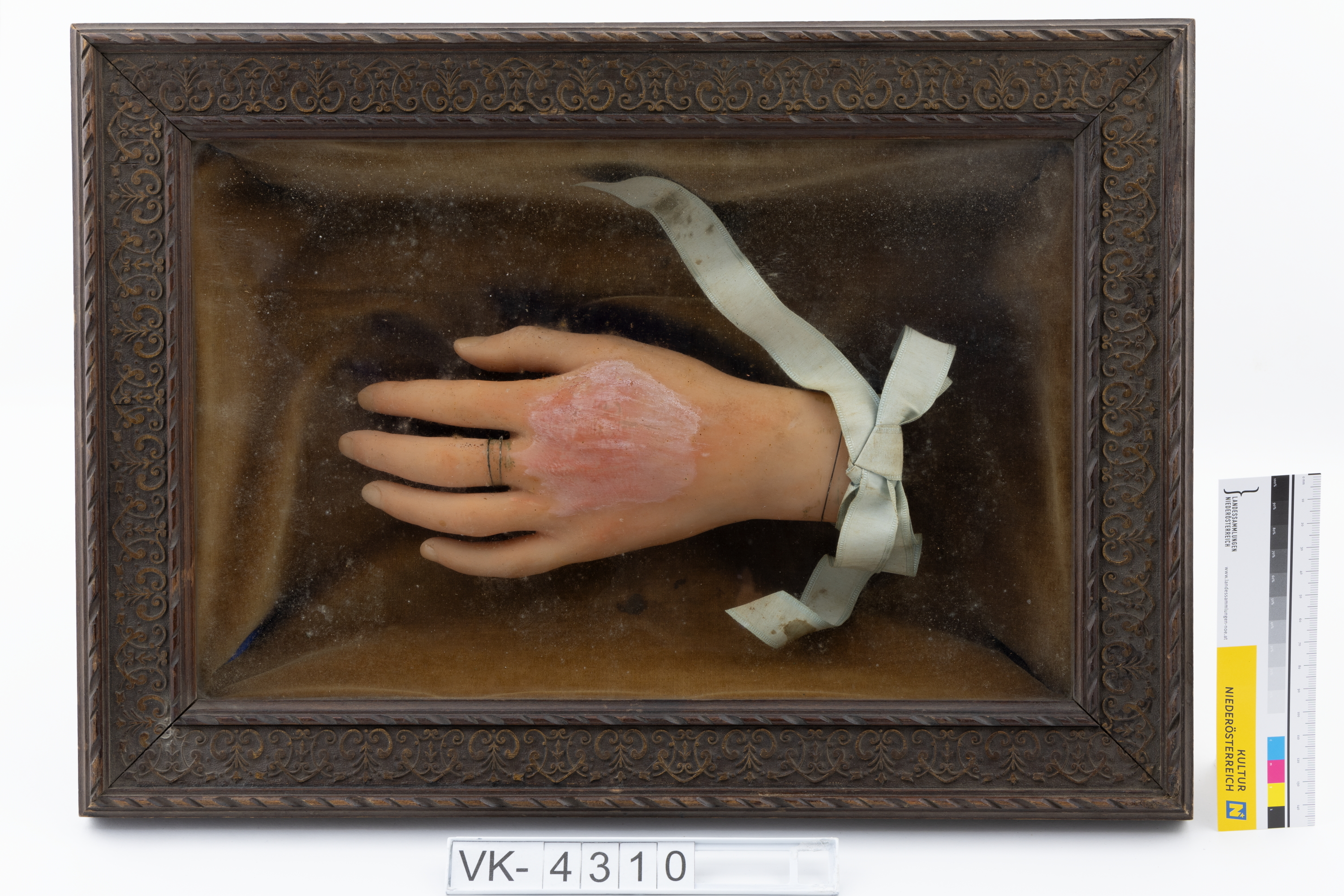 Wachshand in einem mit braunem Samt ausgeschlagenen Kastenbild hinter Glas in einem ornamental verzierten Holzrahmen. Um das Handgelenk ist ein weißes Band gebunden.