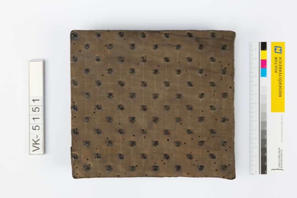Färbermodel aus Holz mit Metallstiften und Metallelementen und zwei Kerben auf der Rückseite. Druckmuster: Kleine stilisierte Blütenelemente, (Muster Nr. 51 des Druckers).
