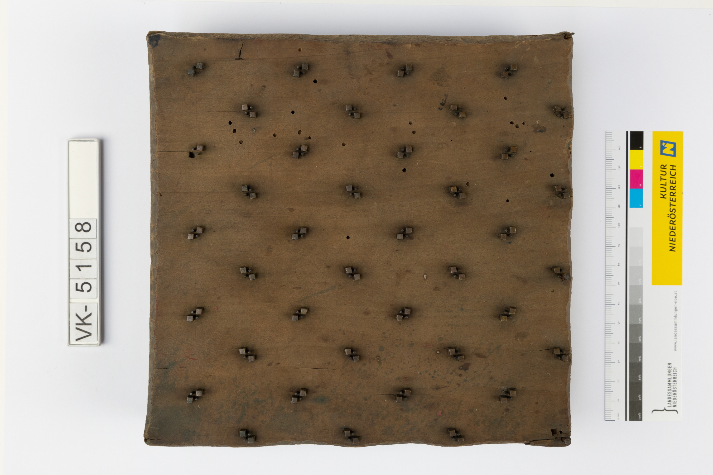 Färbermodel aus Holz mit Metallstiften und Metallelementen und zwei Kerben auf der Rückseite. Druckmuster: Muster aus kleinen Elementen zu je zwei Punkten und zwei Quadraten, (Muster Nr. 10 des Druckers).