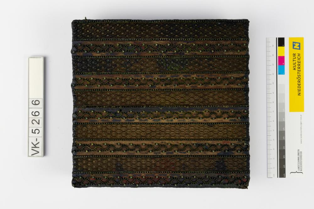 Färbermodel aus Holz mit Metallstiften und Metallelementen auf einer Trägerplatte mit zwei Kerben. Druckmuster: Musterborten aus ornamentalen Mustern und silisierten Blütenranken, mit Resten dunkelblauer und grüner Farbe.
