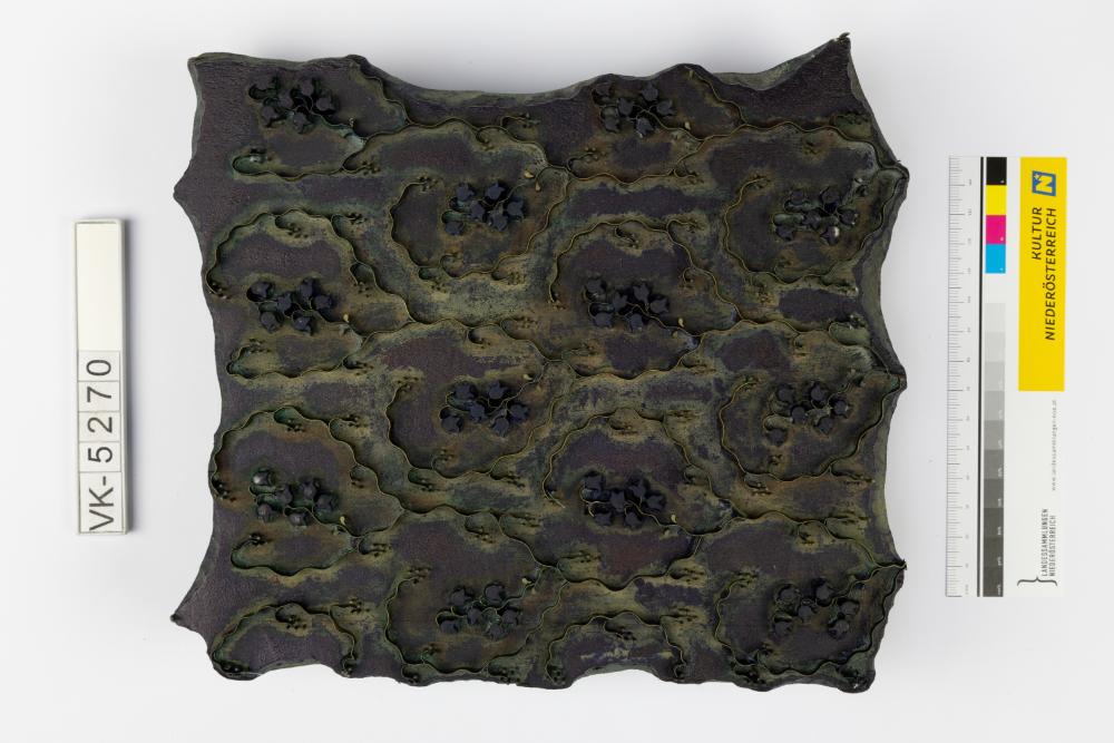 Färbermodel aus Holz mit Metallstiften und Metallelementen und mit zwei Kerben auf der Rückseite. Druckmuster: Gewellte Ranken mit Glockenblumen, (laut Inventarbuch Muster Nr. 108 des Druckers), mit Resten dunkelblauer Farbe.