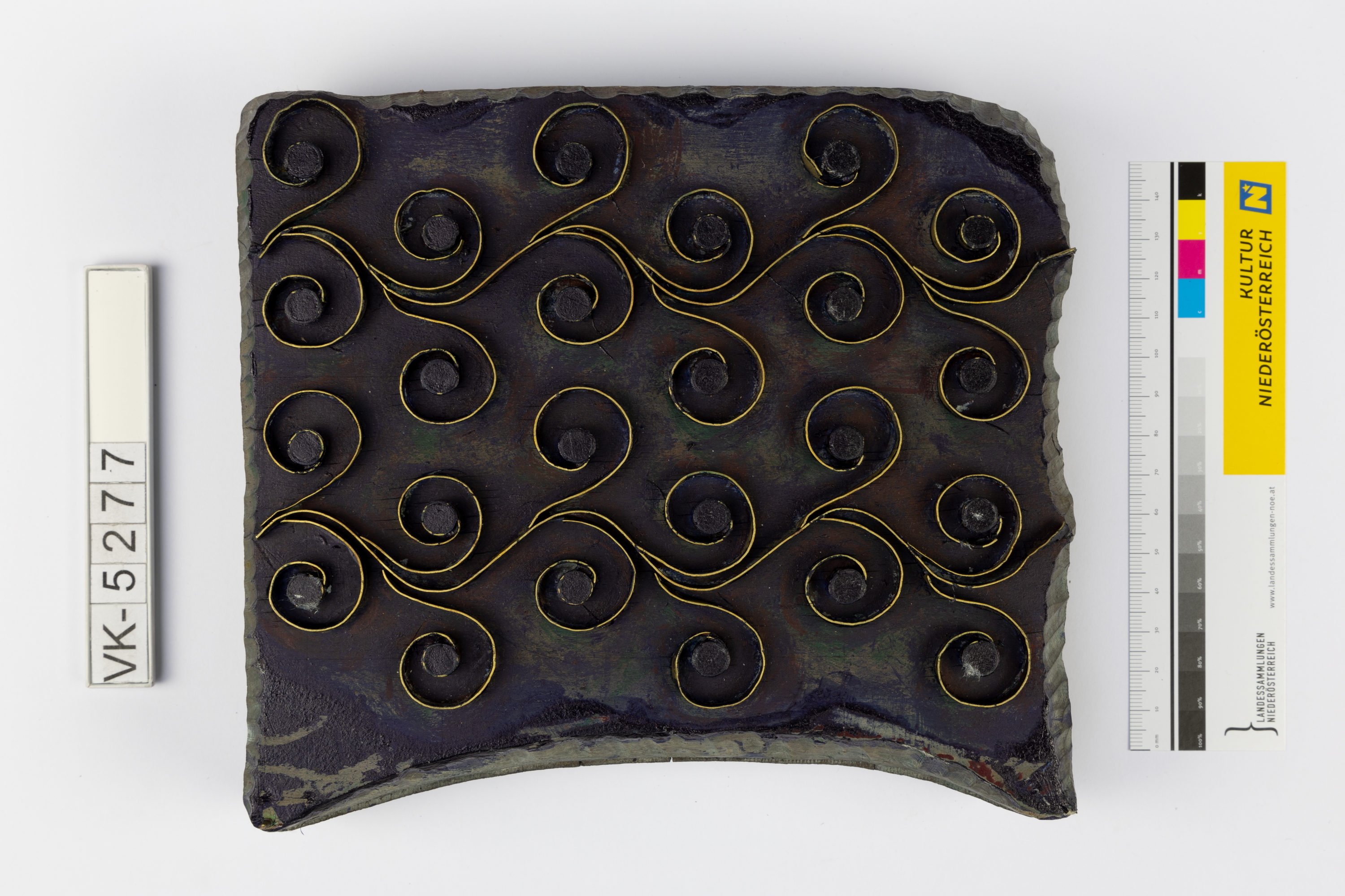 Färbermodel aus Holz mit Metallelementen auf einer Trägerplatte mit zwei Kerben. Druckmuster: Wellenlinien mit Volutenelementen, (laut Inventarbuch Muster Nr. 129 des Druckers), mit Resten dunkelblauer Farbe.