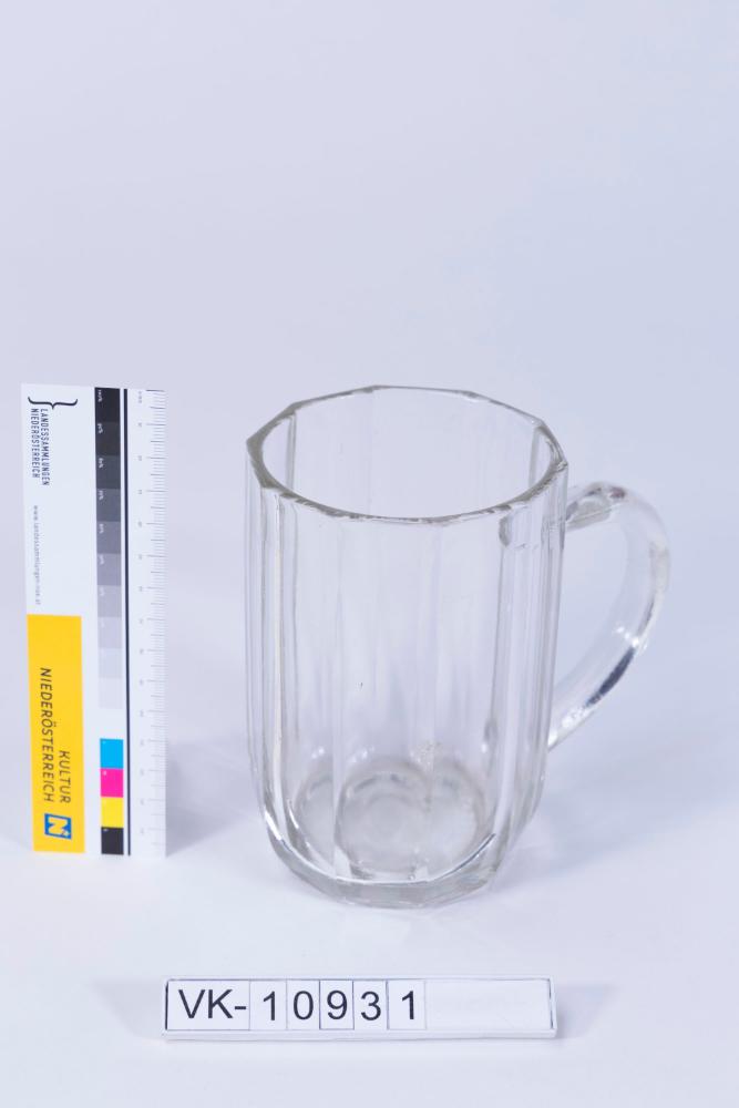 Bierglas mit Henkel, senkrecht profiliert, mit eingegossener Beschriftung: Eichstrich, "0.5l". Das Glas hat eine Bodengravur: "Ullmann Andreas".