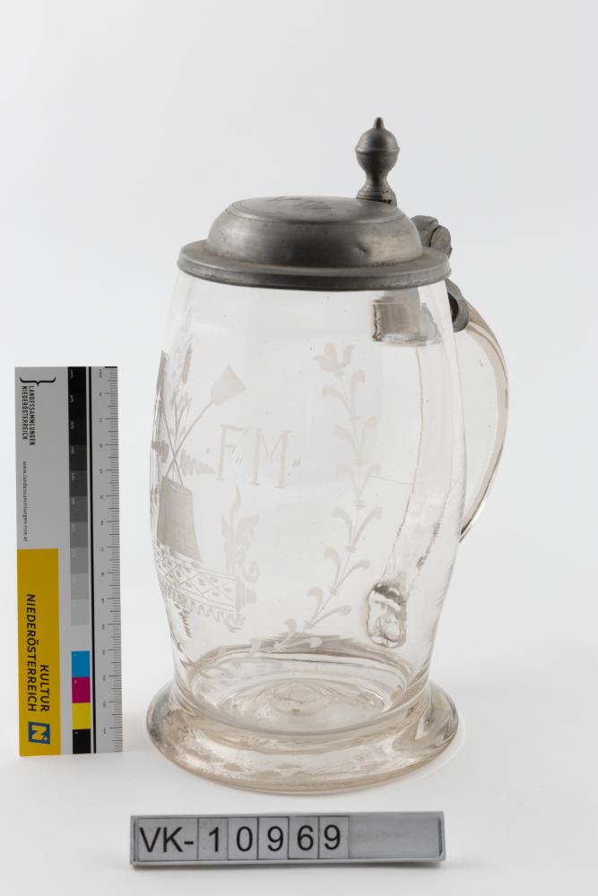 Bauchiges Bierglas mit Henkel und einer Gravur: Darstellung von Binderwerkzeugen, Verzierung, Beschriftung "MFM". Das Glas hat eine Zinnmontierung mit Daumendrücker und einer Gravur: "VW". Es handelt sich um einen "Humpen" der Fassbinder.