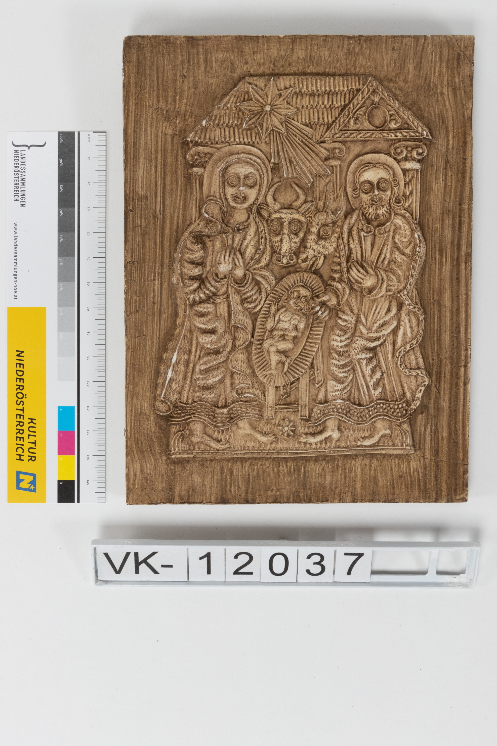 Gipsabguss eines Lebzeltermodels, braun bemalt: Halbrelief mit einer Darstellung des Stalls von Bethlehem. Auf der Rückseite ist ein Stempel des Österreichischen Museums für Volkskunde.
