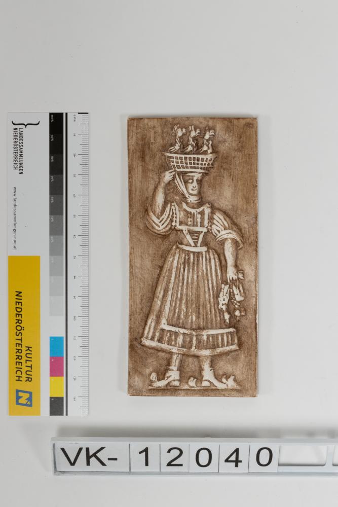 Gipsabguss eines Lebzeltermodels, braun bemalt: Halbrelief einer Frau in Tracht mit Hühnerkorb auf dem Kopf und Hühnern in der Hand (Marktgeherin). Auf der Rückseite ist handschriftlich eine Notiz angebracht: "Bauernmuseum Illerbeuren 19.Jhd".