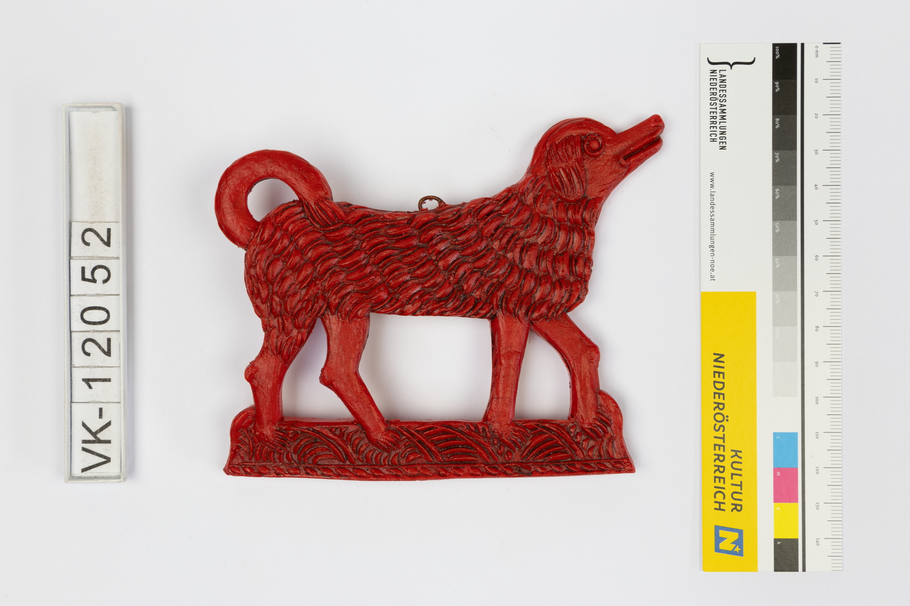 Wachsabguss eines Lebzeltermodels, aus rotem Wachs, mit der Darstellung eines Hundes mit erhobenem Kopf.