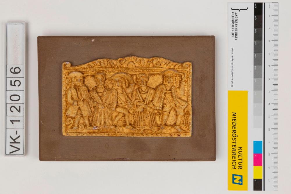 Abguss eines Lebzeltermodels mit der Darstellung einer Bühne mit Schauspielern und einem Geigenspieler. Das Model ist hellbraun auf einer dunkelbraunen Gipsplatte. Wie VK-21069.