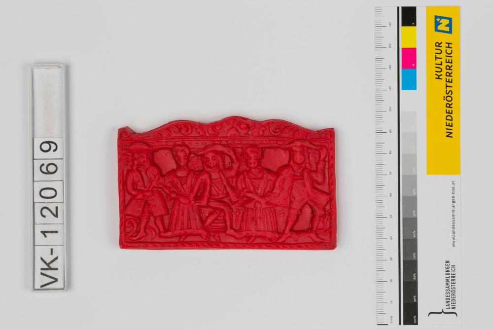 Abdruck eines Lebzeltermodels mit der Darstellung einer Bühne mit Schauspielern und einem Geigenspieler. Wie VK-12056.