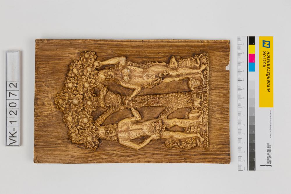 Abguss eines Lebzeltermodels mit der Darstellung von Adam und Eva unter dem Baum der Erkenntnis. Auf der Rückseite ist ein Stempel: "ÖSTERREICHISCHES MUSEUM FÜR VOLKSKUNDE ...".