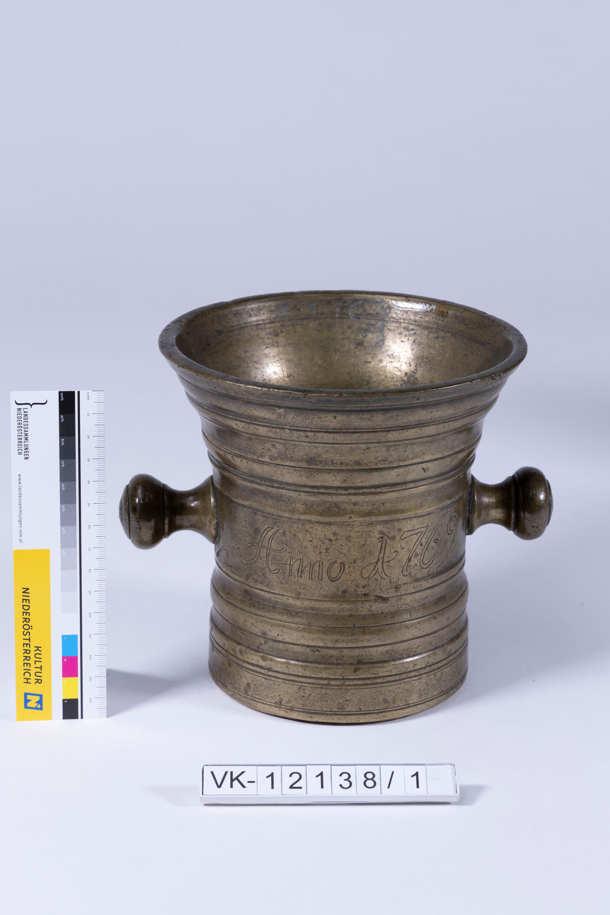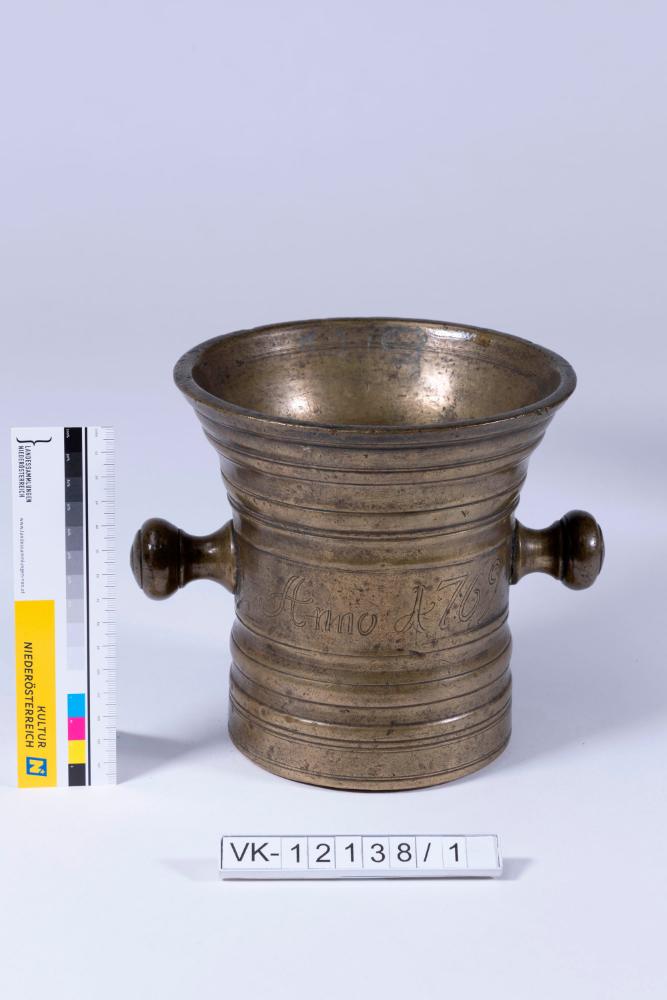 Messingmörser mit Wulstverzierungen, zwei knaufartigen Handhaben und einer Gravur: "Anno 1769", "Franciscus Hauer".