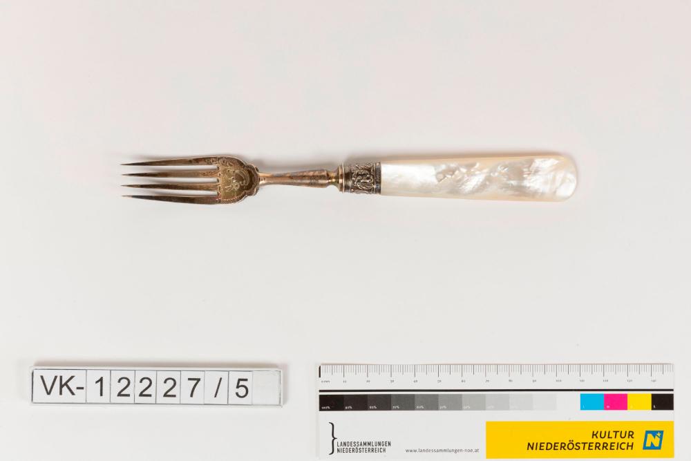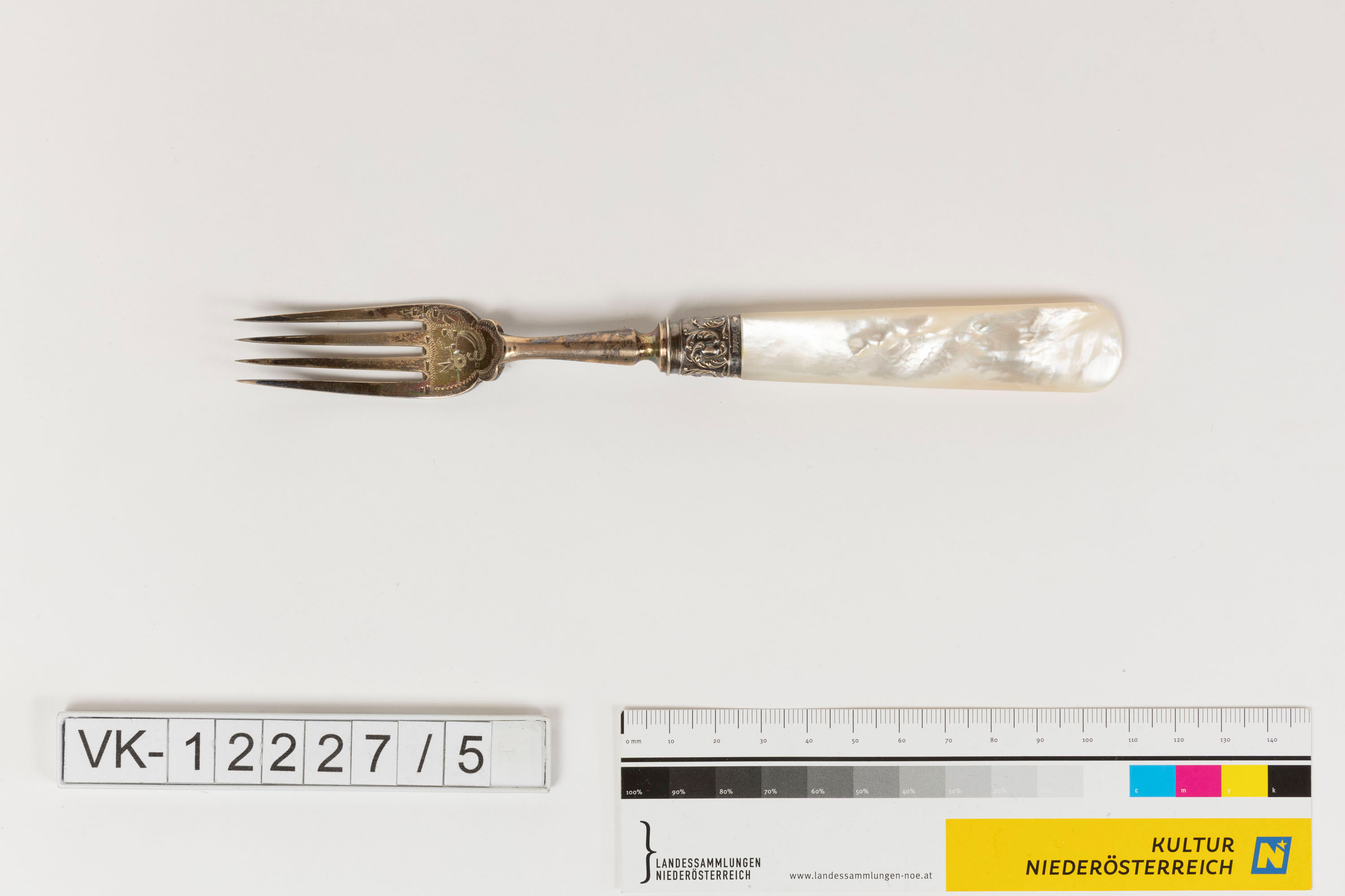 Vierzinkige Gabel aus Silber mit ornamental-floraler Verzierung, mit eingesetztem Perlmuttheft. Die Gabel ist am Schaft punziert: Krönchen, Löwe, "f", "JDWD".