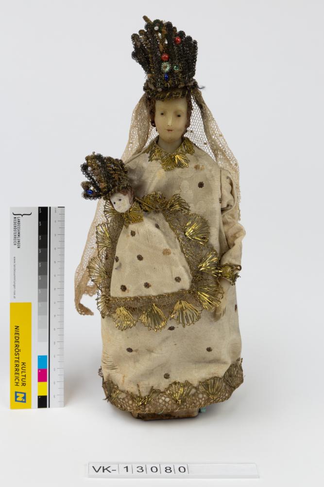 Wachsfigur "Maria im Kind" auf einem Holzsockel, bekleidet mit beigem Seidenrips mit Golddrahtspitzenverzierung, mit zwei Krönchen mit Glasperlenverzierung und einem weißen Tüllschleier. Das Objekt war eine Leihgabe an das Barockmuseum Heiligenkreuz-Gutenbrunn.