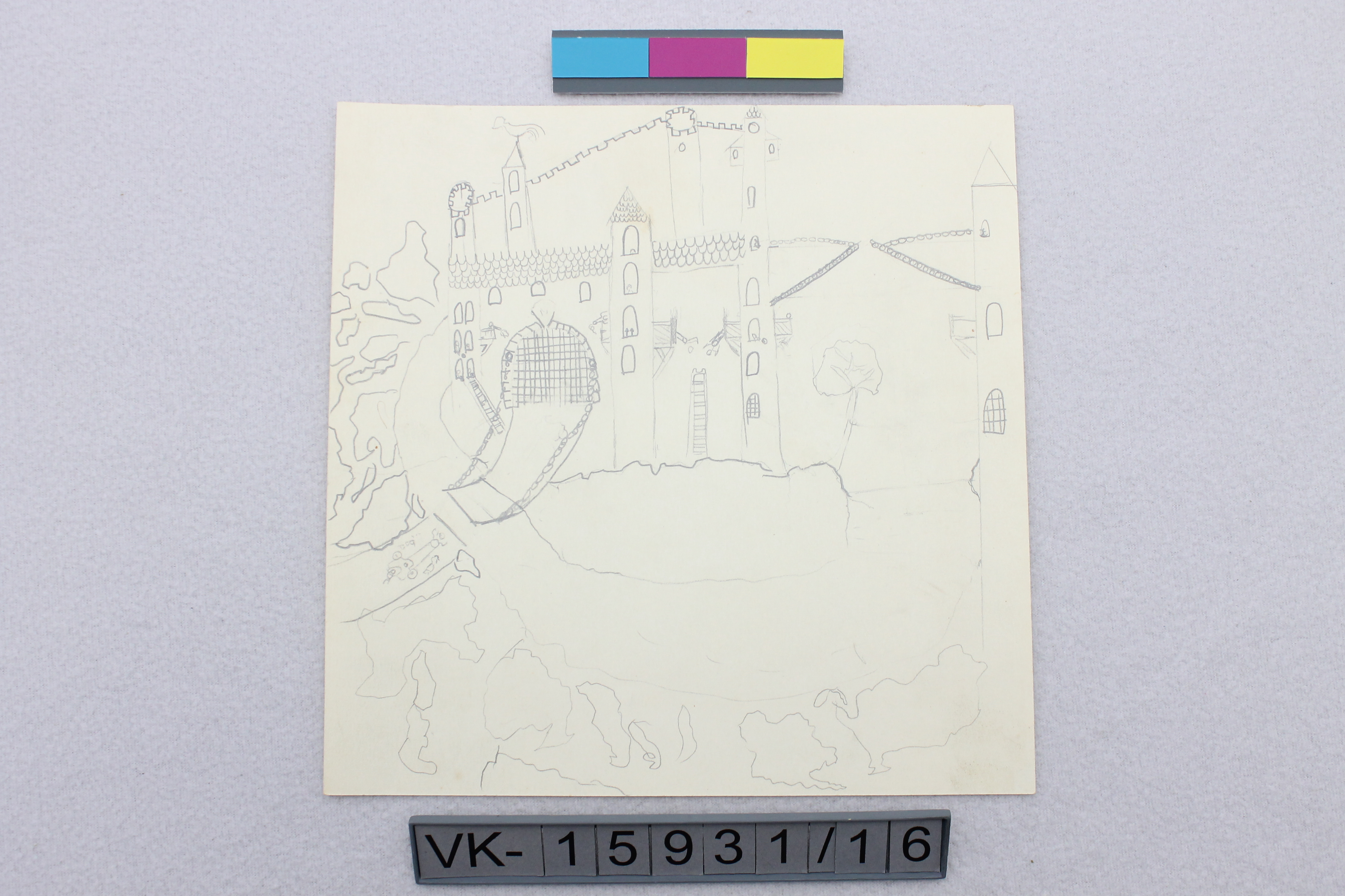 Bleistiftzeichnung auf Papier: Burg. Auf der Rückseite: "REIDLINGER". Die Zeichnung stammt von Kurt Reidlinger, geboren 1943 in Straßhof, aus seiner Hauptschulzeit bei den Schulbrüdern. Die Zeichnung befindet sich in der Mappe mit der Inventarnummer VK-22583.