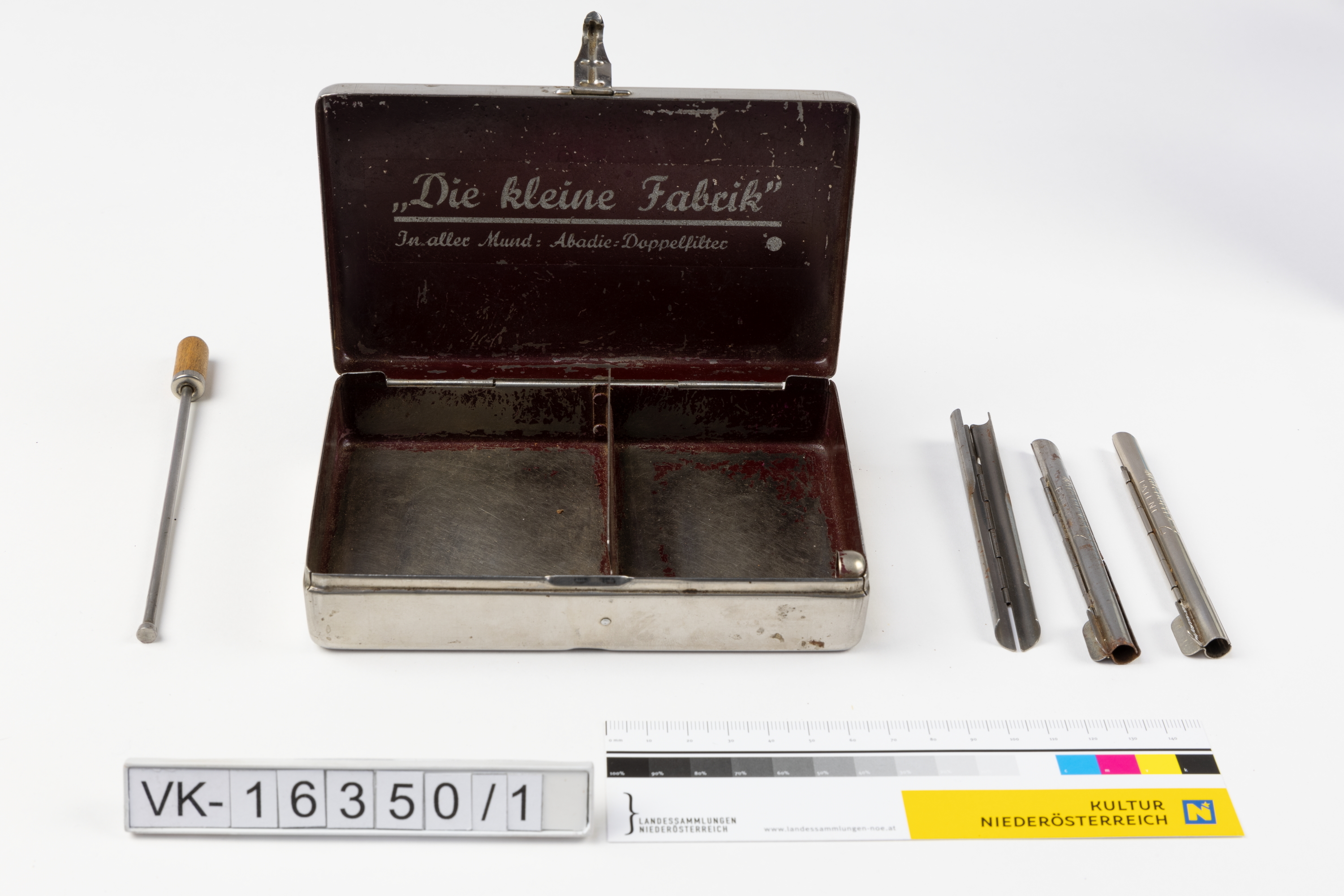 Rechteckige Blechschachtel (VK-16350_1a) mit einem Verschlussriegel und Inneneinrichtung: Trennwand, Aufnahme für den Stopfergriff. Die Schachtel war innen weinrot lackiert und hat im Deckel eine Aufschrift: "Die kleine Fabrik In aller Mund: Abadie = Doppelfilter". Zur Ausstattung gehören ein Stopfer mit Holzgriff (VK-16350_1b) und drei Zigarettenstopfhülsen (VK-16350_1c bis VK-16350_1e) mit Scharnier und Prägung: "MAYA DUPLEX PATENT 2".
