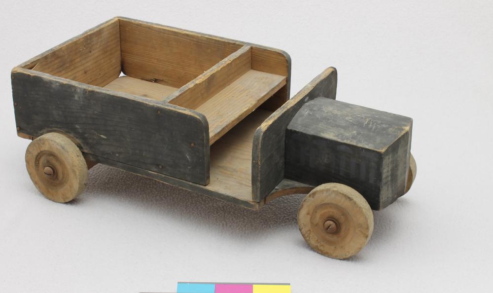 Holzauto, offen mit einer Sitzbank und einer Pritsche dahinter. Die Außenflächen sind schwarz bemalt. Auf der Unterseite ist eine Beschriftung mit Filzstift geschrieben: "... zum Andenken von der Ortsgruppe Spratzern 25.12.1943".