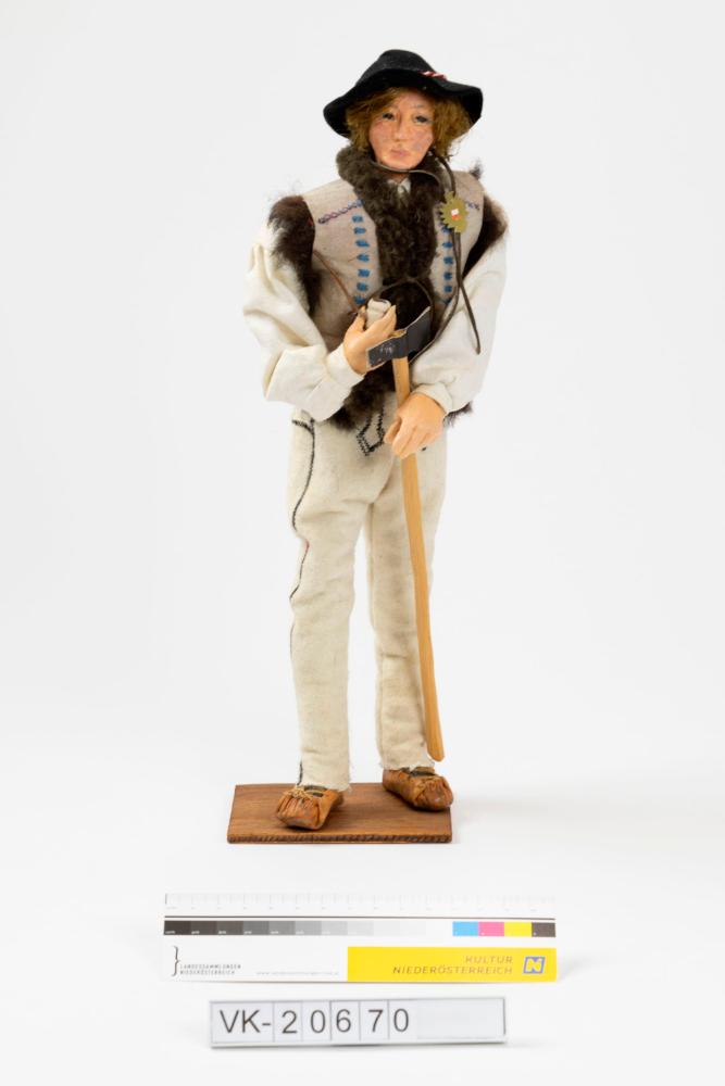 Männerfigur (VK-20670a) in Tracht mit beiger, schwarze paspelierter Hose, braunen Schuhen, weißem Hemd und einer hellgrau-braunen Pelzweste. Der Mann trägt einen Lodenhut und hat eine Pfeife und eine Hacke mit langem Stiel (VK-20670b) und ist auf einem Holzbrettchen montiert.