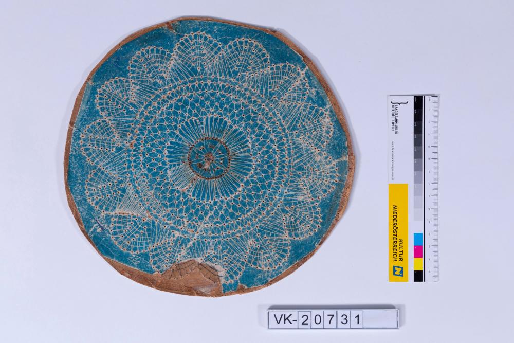 Klöppelbrief für ein rundes Spitzendeckchen (belichtetes Fotopapier), aufgeklebt auf Karton, gelocht. Die Vorlage ist an einer Stelle ausgerissen, von Hand ergänzt. Die Rückseite des Kartons ist zusätzlich mit Packpapier beklebt. Fr. Bracher veranstaltete in den 1970er- und 1980er-Jahren Klöppelkurse über den ÖFB.