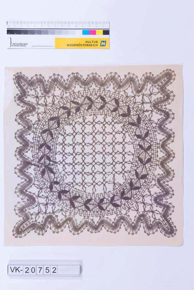 Zwei Vorlagen für Klöppelbriefe: Abbildungen eines quadratischen Spitzendeckchens mit rundem Mittelteil (belichtetes Fotopapier). Auf der Rückseite jeweils eine Preisnotiz: "15.-" (ATS). Fr. Bracher veranstaltete in den 1970er- und 1980er-Jahren Klöppelkurse über den ÖFB.