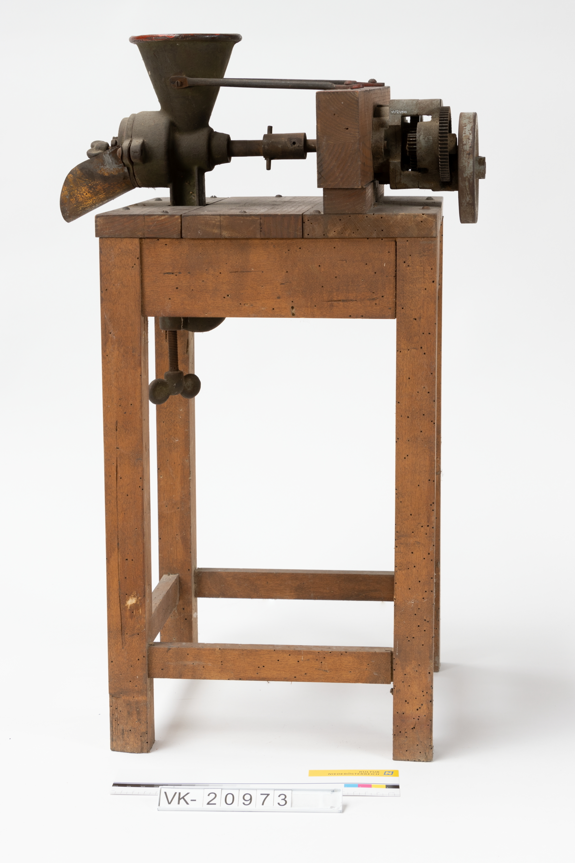 Gusseiserner Fleischwolf mit Trichter und einer Flügelmutter für die Feineinstellung, befestigt auf einem vierfüßigen braunen Holztischechen. Der Fleischwolf wird über eine Welle und ein Untersetzungsgetriebe mit Schwungrad angetrieben.