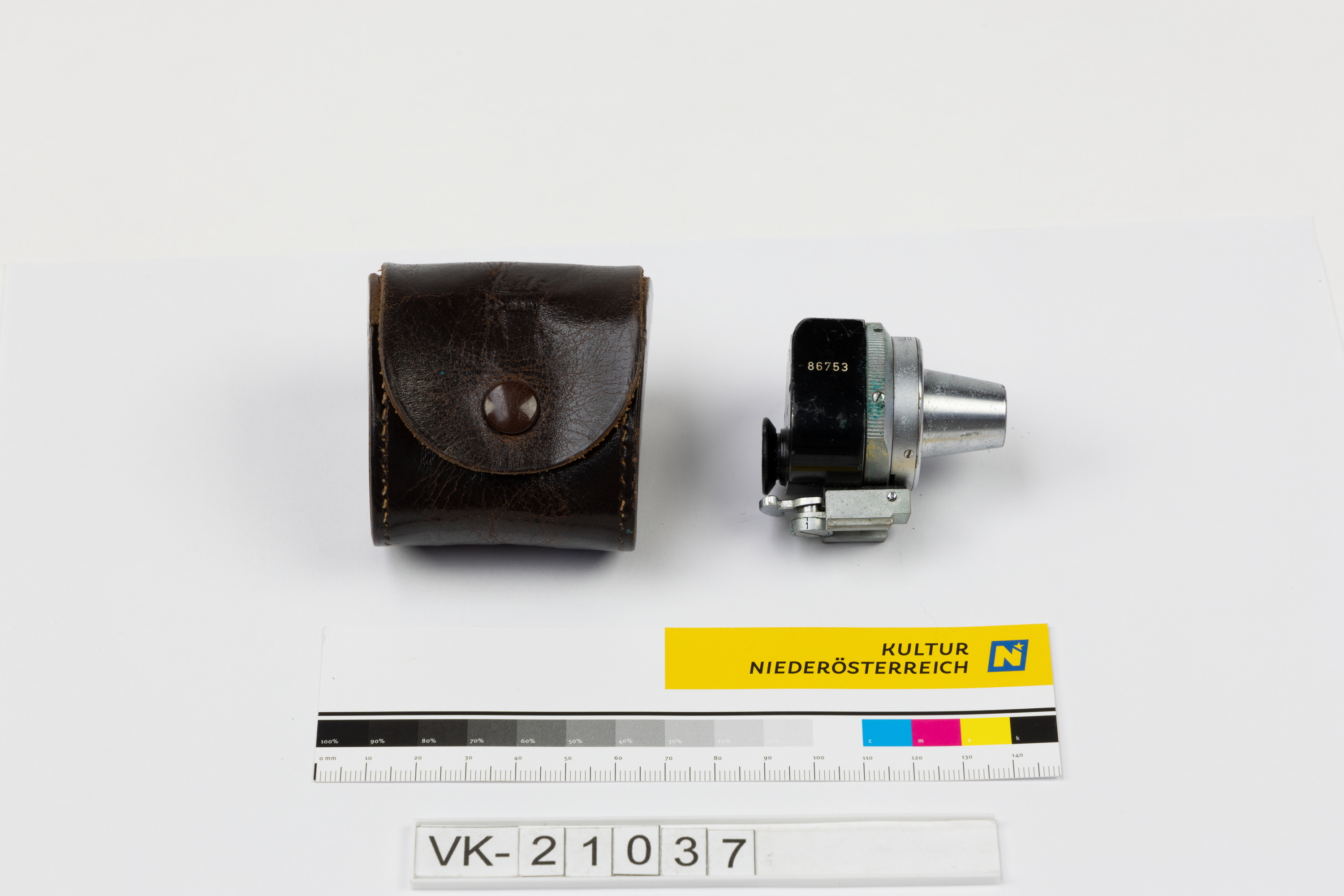 Aufstecksucher (VK-21037a) mit Klemmschiene und Blitzschuh, Entfernungseinstellung und optischer Korrekturmöglichkeit. Das Gehäuse ist teilweise schwarz lackiert und mit einer Beschriftung versehen: "E. LEITZ WETZLAR GERMANY ...". Zur Aufbewahrung hat der Sucher einen dunkelbraunen Lederköcher mit Druckknopfverschluss (VK-21037b).