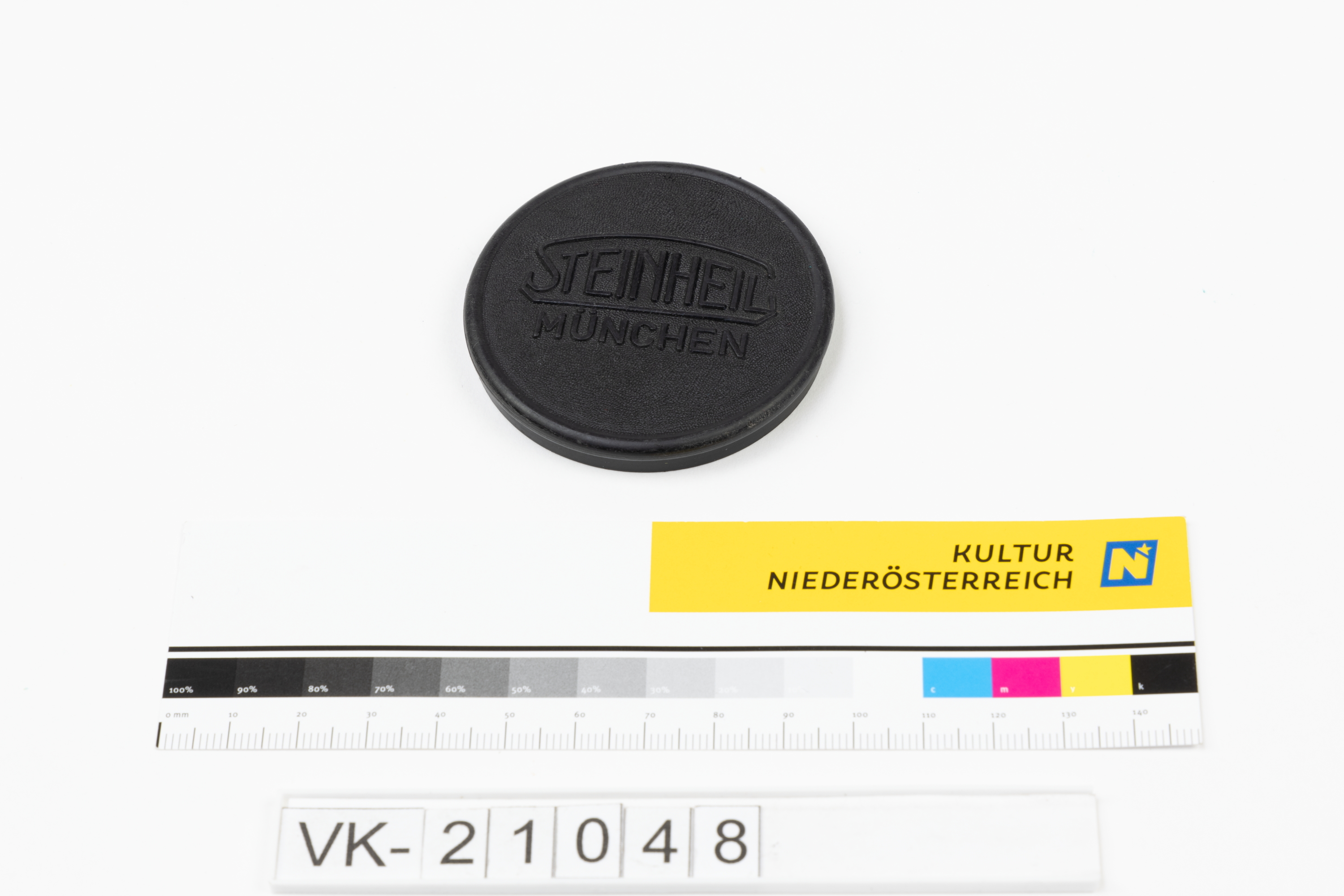 Schwarzer Objektivschutzdeckel mit Beschriftung: "STEINHEIL MÜNCHEN". Der Objektivdeckel befindet sich auf dem Objektiv mit der Inventarnummer VK-21047.
