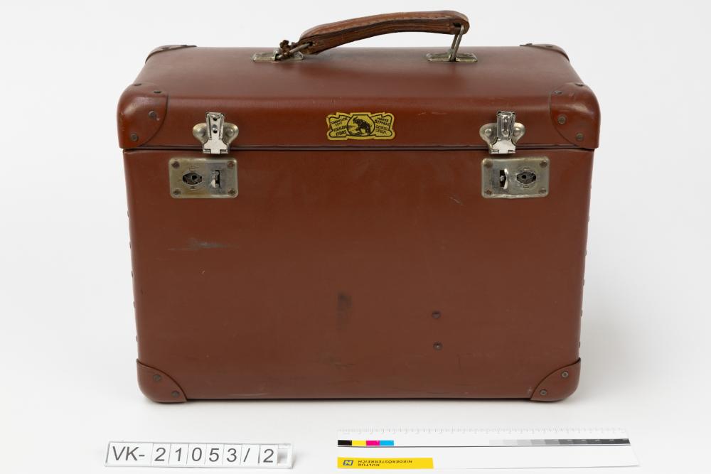 Brauner Koffer mit zwei Verschlüssen, verstärkten Ecken und einem Ledertragegriff. Der Koffer hat einen Aufkleber mit der Darstellung eines Elefanten und der Aufschrift: "GARANTIERT ECHT VULKAN FIBRE MARKE ELEPHANT GESETZL. GESCH.", am Griff ist ein Schlüssel befestigt.