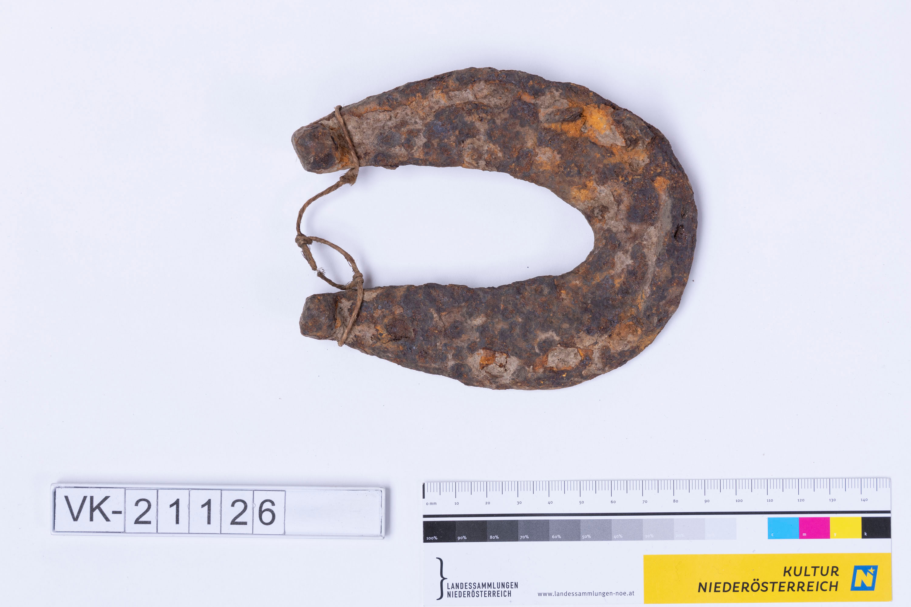 Schmiedeeisernes Hufeisen mit Resten eingerosteter Nägel. Möglicherweise stammt das Objekt aus der Mittelaltersammlung.