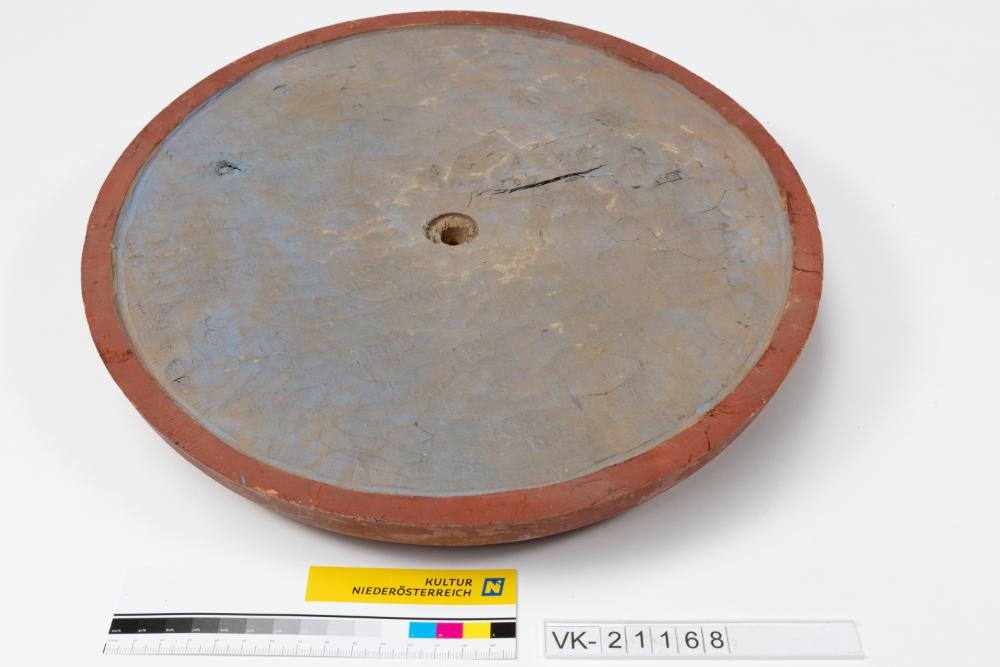 Hellblau lackierte Holzscheibe, im Randbereich rot, in der Mitte eine Bohrung mit Innengewinde.
