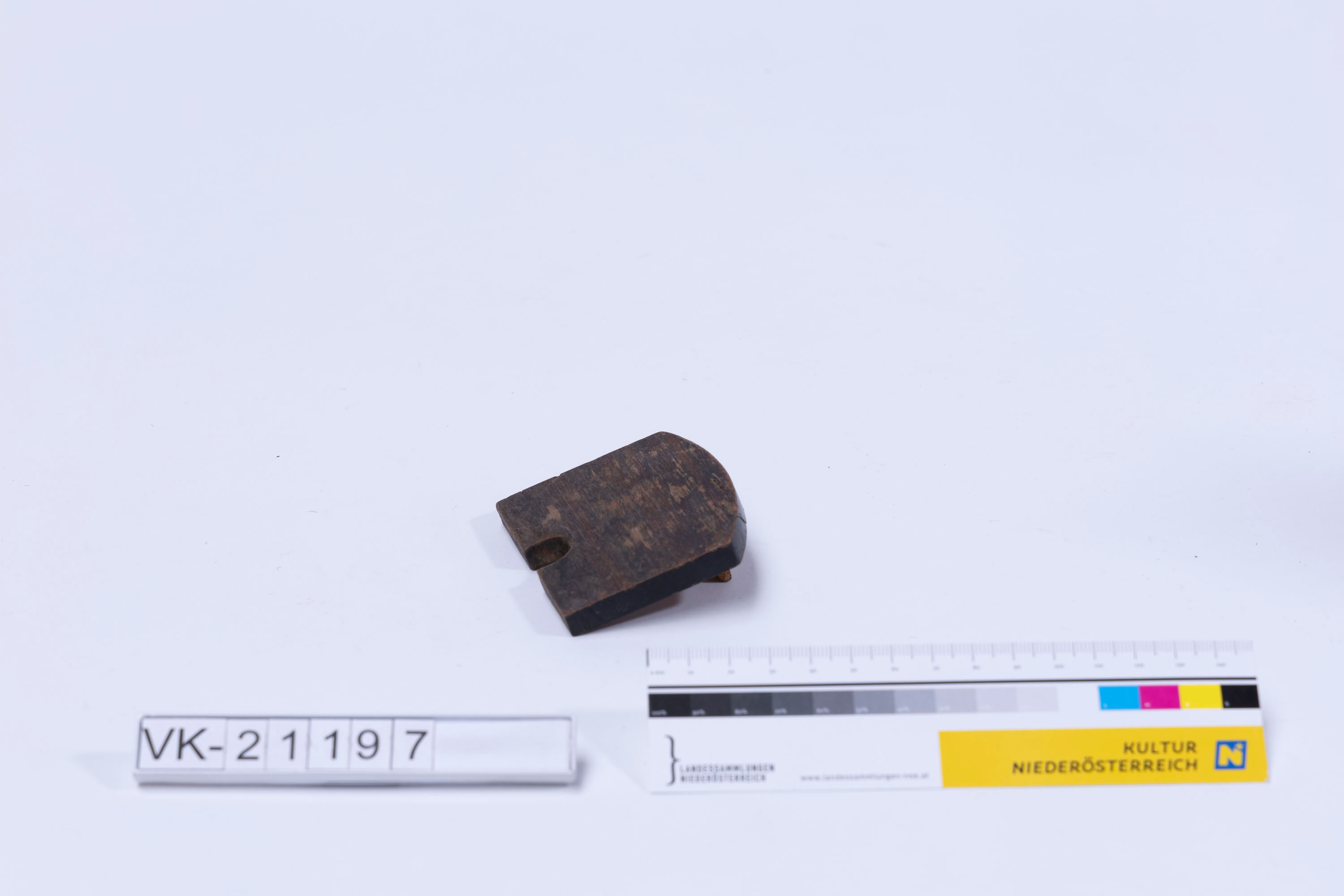 Holzbrettchen mit einer Abstützung und einem Ausschnitt, Fragment. Möglicherweise gehört das Objekt VK-21196 dazu.