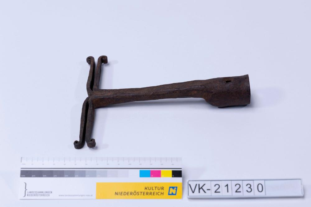 Schmiedeeiserner Kienspanhalter mit zwei Aufnahmen und einer angeschmiedeten Tülle.