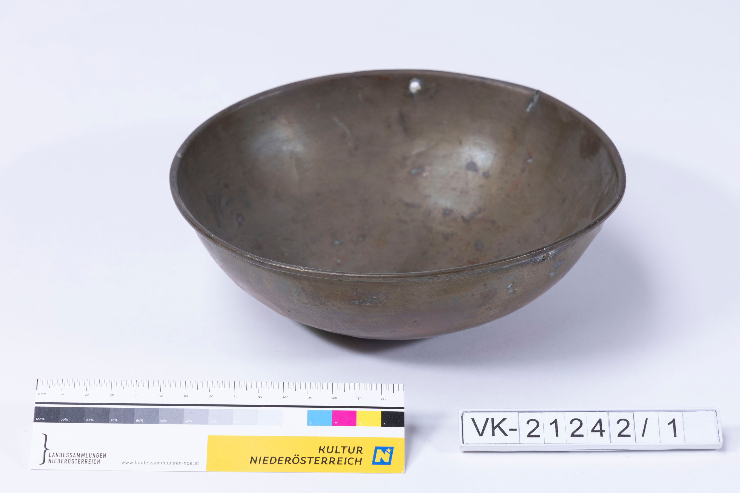 Runde Waagschale aus Messing mit umgelegtem Rand und drei Bohrungen zur Aufnahme der Aufhängung.