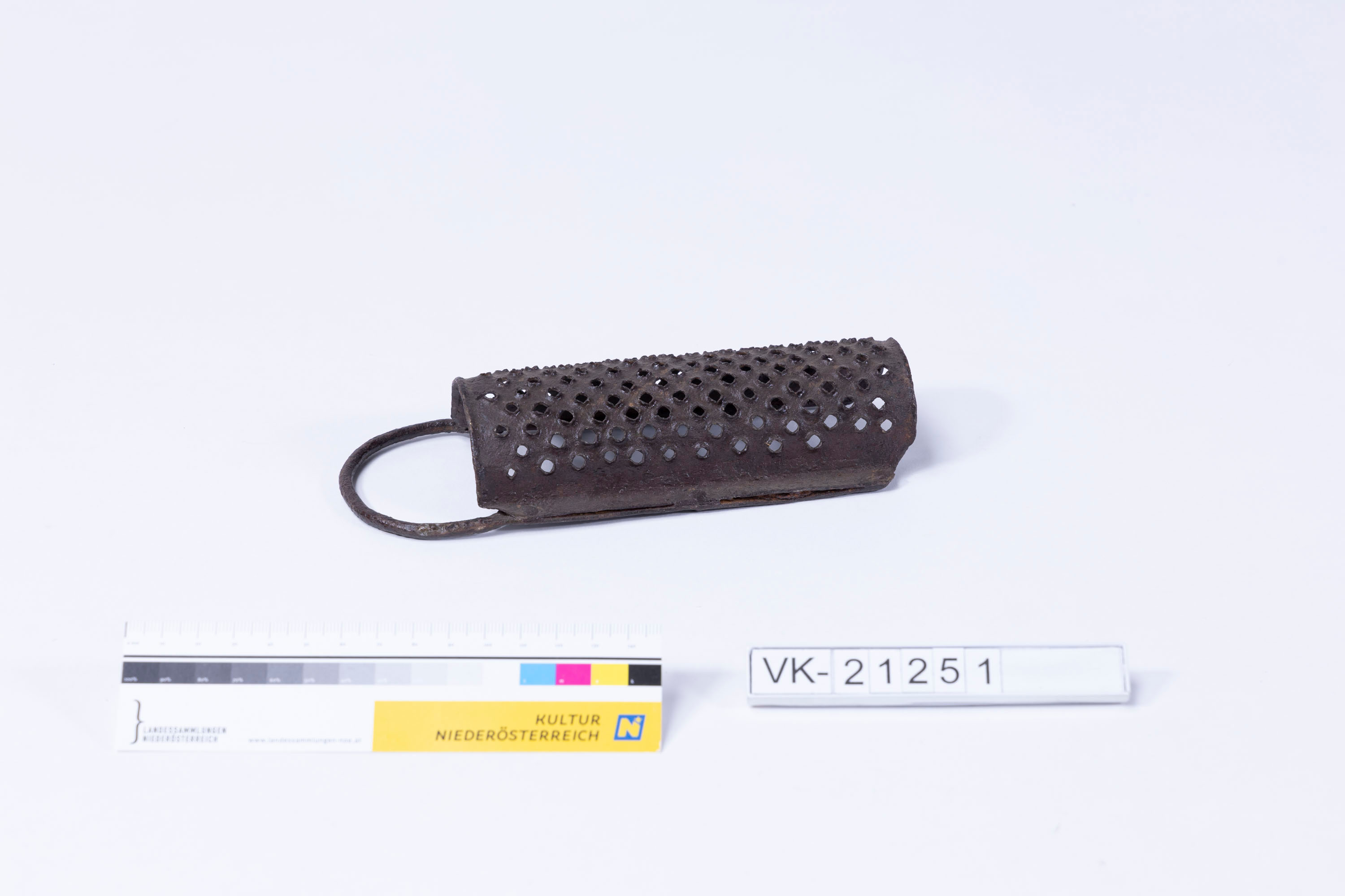 Reibe aus gelochtem Blech, mit halbrundem Profil und einem Henkel.