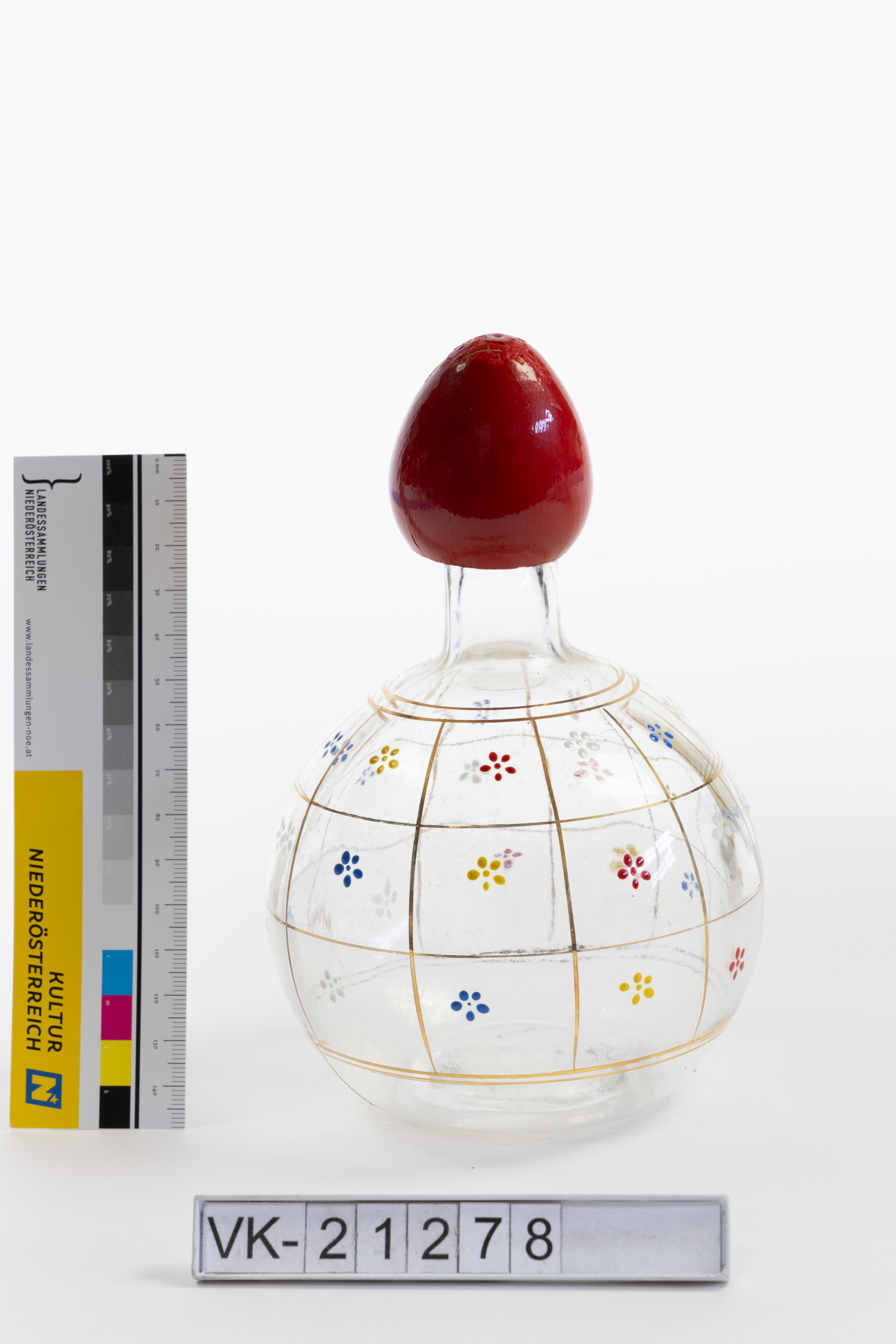 Kugelige Glasflasche mit kurzem Hals. Die Flasche ist mit einem goldenen Gitter, darin stilisierte kleine Blüten in gelb, rot, weiß und blau, bemalt und hat einen eiförmigen roten Holzverschluss.