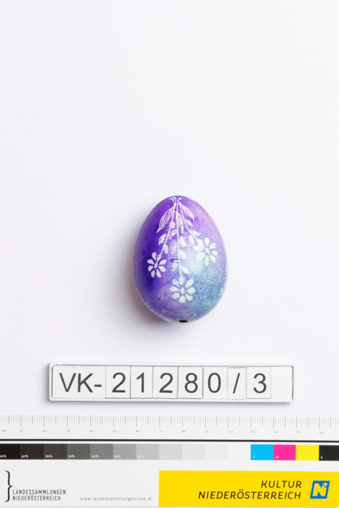 Osterei: Ausgeblasenes Hühnerei, violett gefärbt mit weißer Wachsbatikverzierung: Blümchen. Die Farbe ist nicht einheitlich.