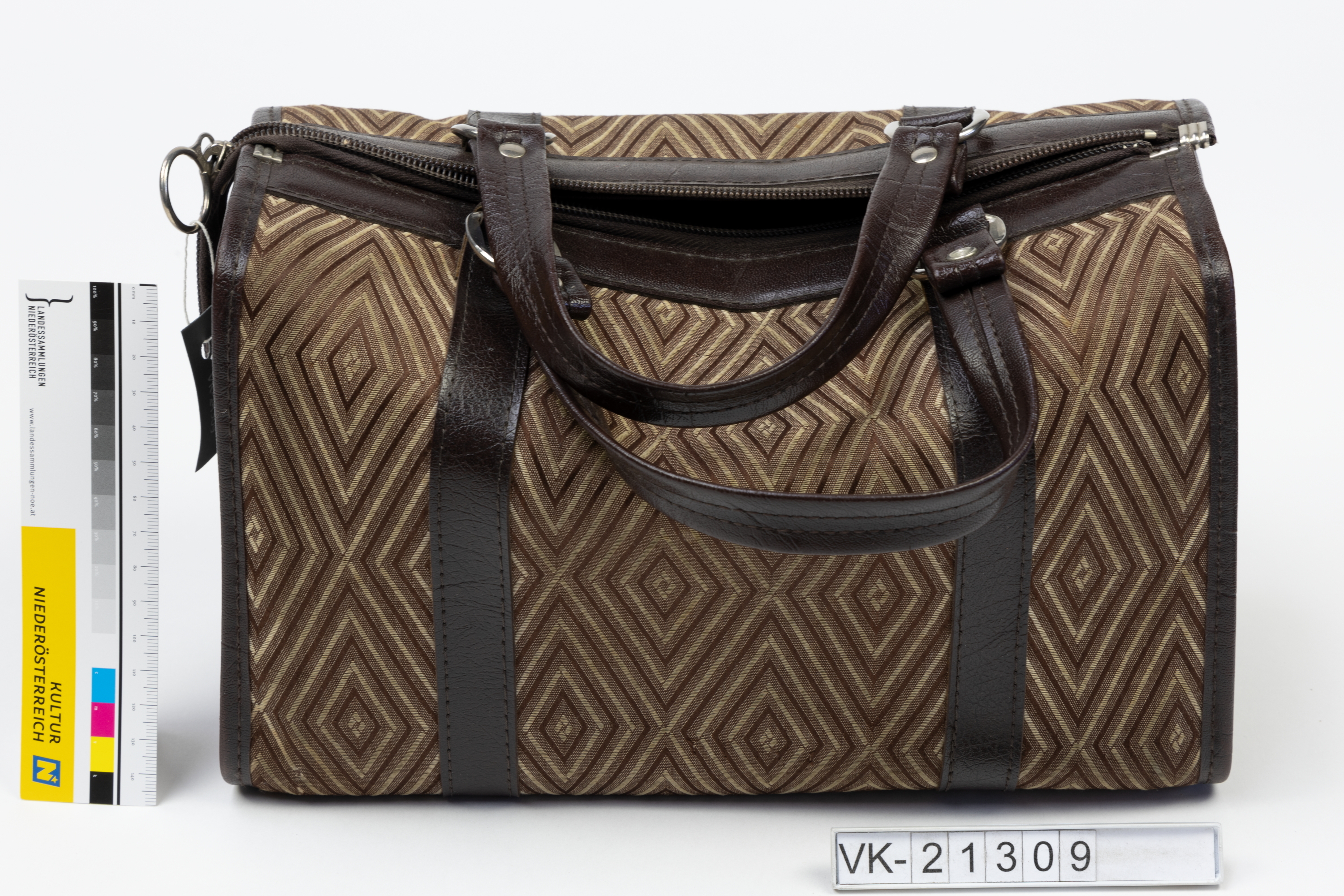 Quaderförmige Tasche aus Kunstfasergewebe mit Rautenmuster in Brauntönen, mit dunkelbraunen Kunstlederapplikationen, zwei Tragehenkeln und einem Reißverschluss. Die Tasche hat ein Seitenfach.