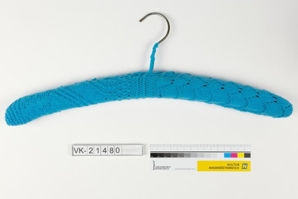 Hölzerner Kleiderbügel (Flachbügel) mit Metallhaken, umstrickt mit blauer Wolle in verschiedenen Strickmustern.