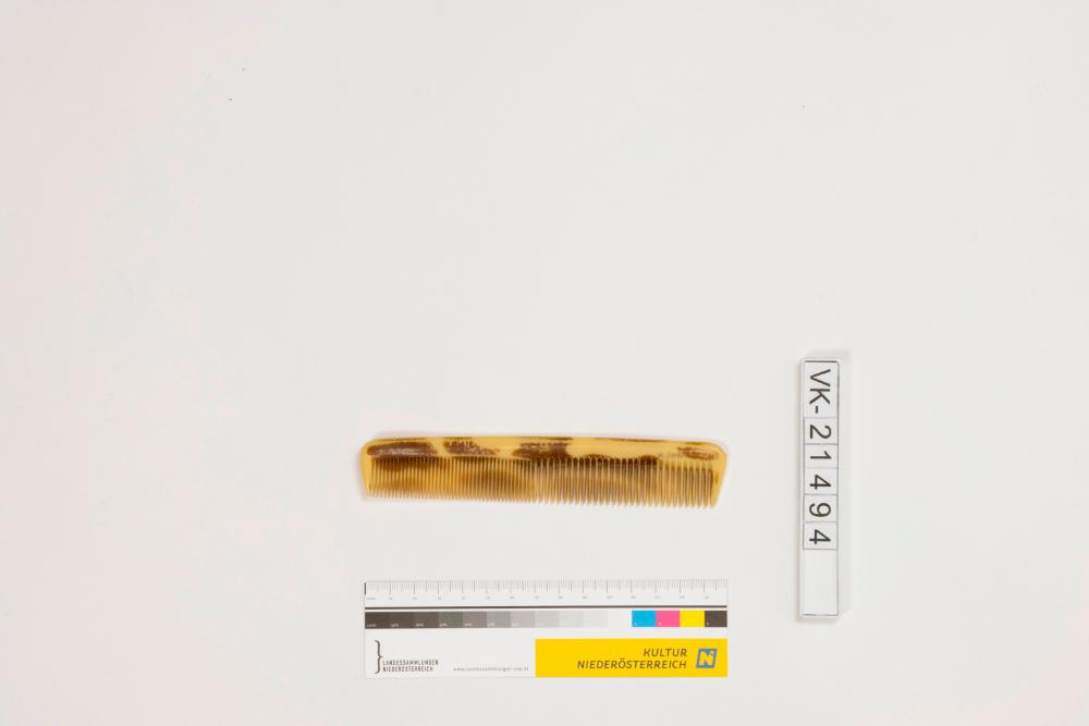 Kunststoffkamm, beige mit brauner Marmorierung in Hornoptik, beschriftet: "GRIMEXTRA UNZERBRECHLICH". Das Objekt befindet sich in der Handtasche VK-21493.