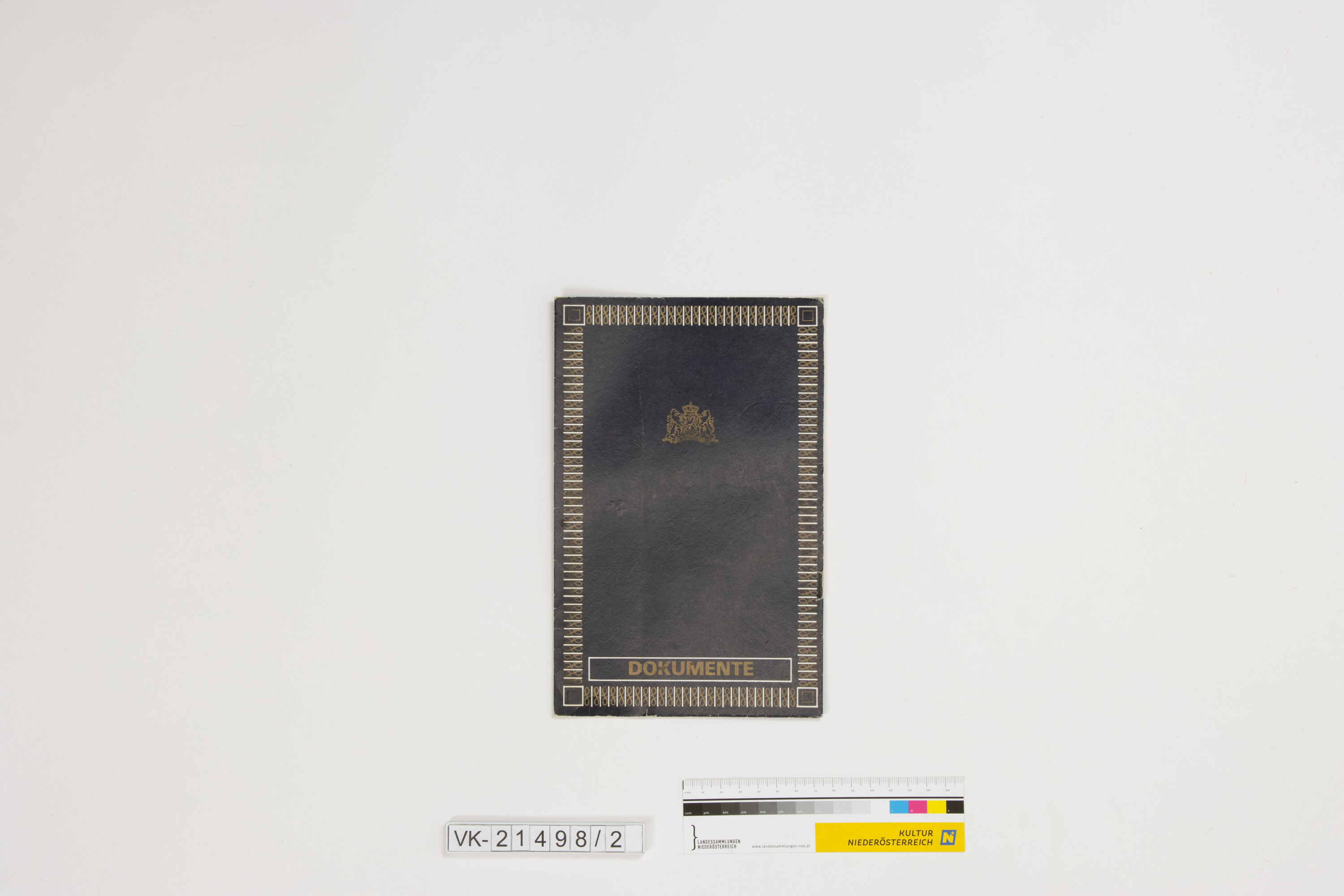 Dunkelblaues, innen weißes Kartonmäppchen mit goldener und weißer Beschriftung und einer Verzierung. Das Mäppchen dient zur Aufbewahrung von Rechnungen oder anderen Kundendaten, es hat die Aufschrift: "DOKUMENTE" und einen Hinweis auf den Gebrauch einer Kundennummer.