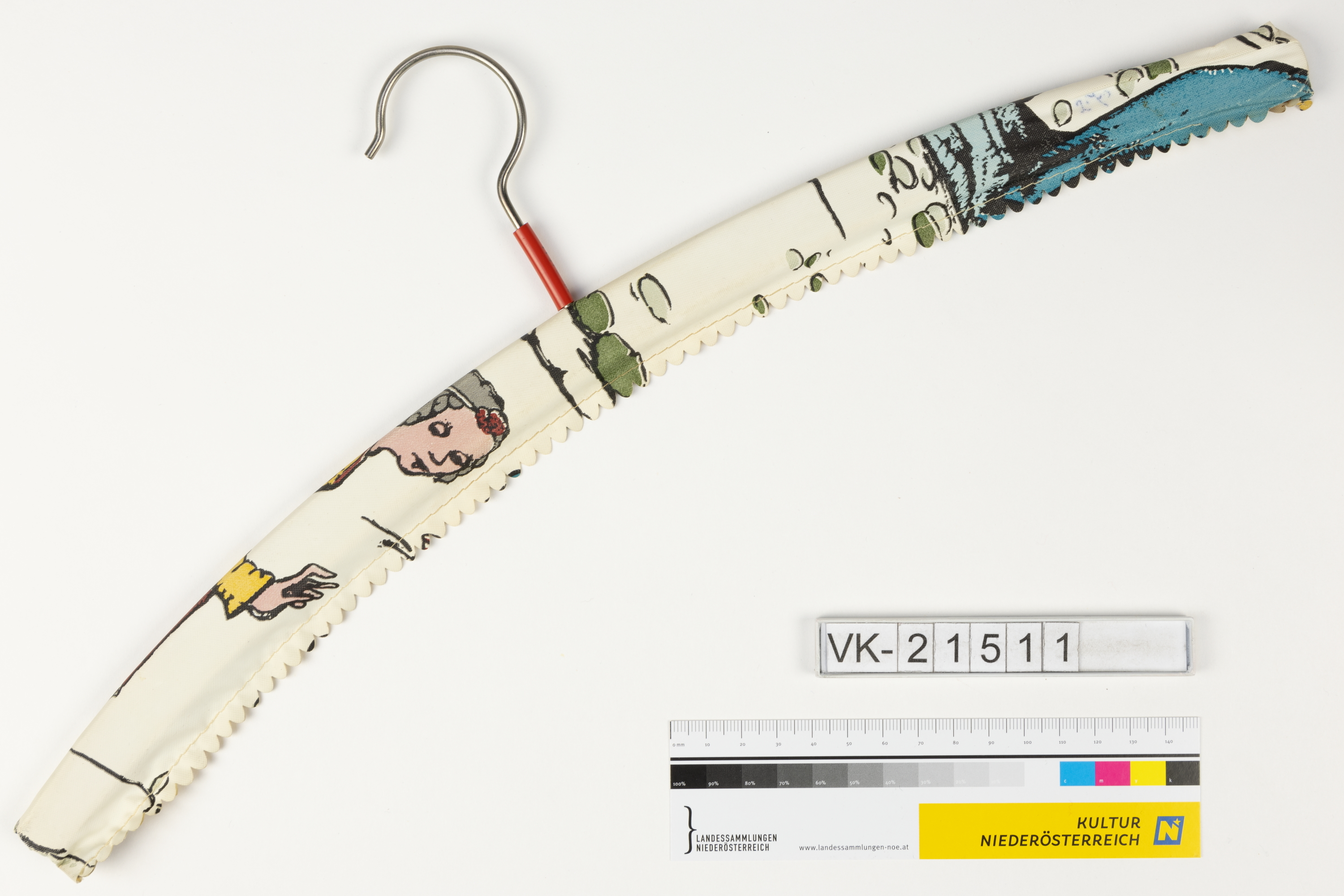 Mit einer bedruckten Kunststofffolie bezogener Holzkleiderbügel (Flachbügel) mit Metallhaken; der Bezug ist mehrfärbig bedruckt mit einer Figur und an der Unterseite in Wellenbögen abgeschnitten.