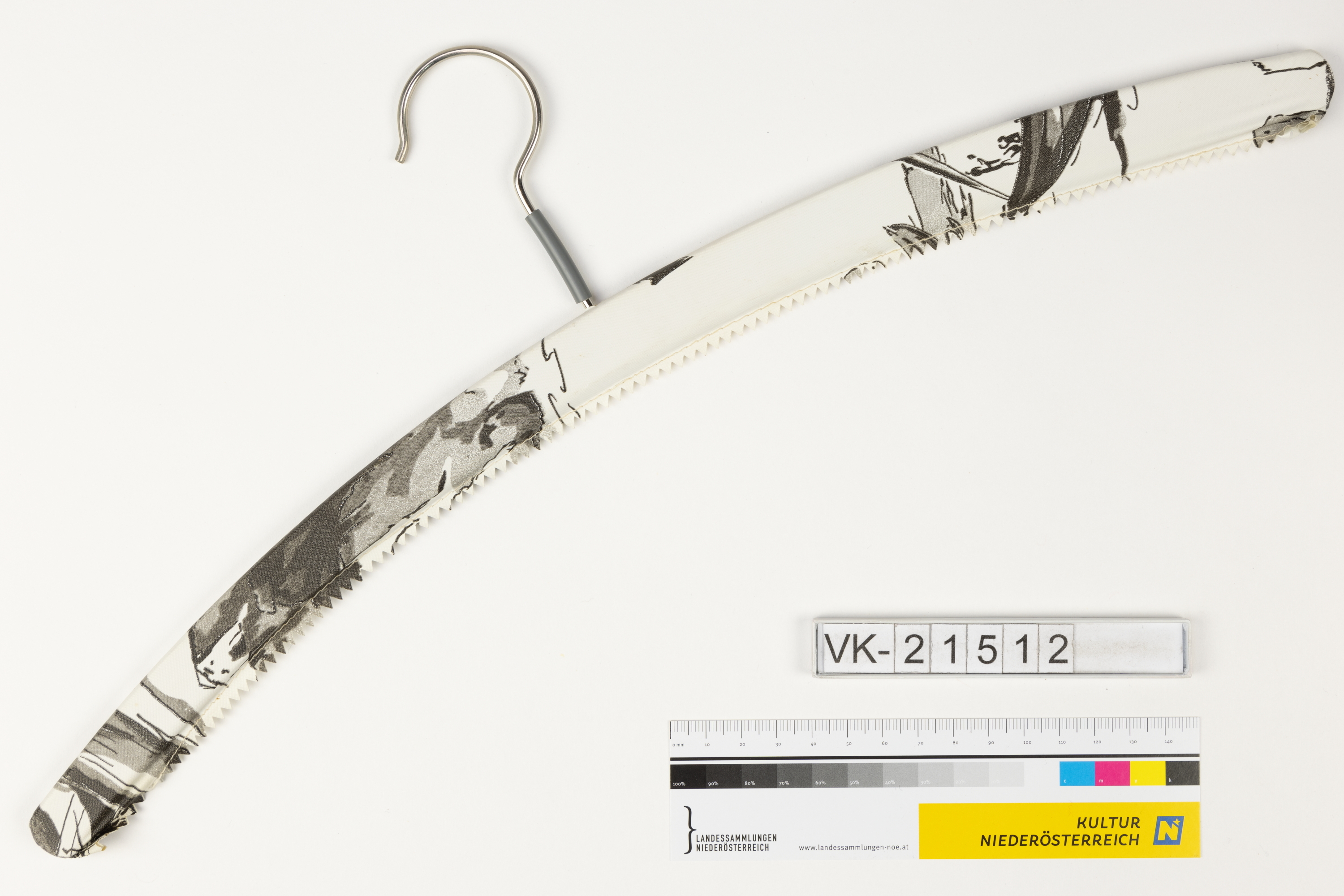 Mit einer bedruckten Kunststofffolie bezogener Holzkleiderbügel (Flachbügel) mit Metallhaken; der Bezug ist schwarz-weiß bedruckt mit einem Seefahrermotiv und an der Unterseite gezackt abgeschnitten. Der Kleiderbügel hat ein Preisschild: "7.20".