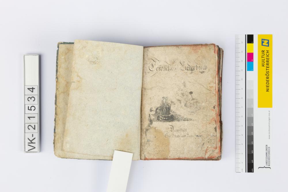 Liederbuch in einem blaugrauen Einband, mit dreiseitig roter Schnittverzierung, "Teutsches Liederbuch Darmstadt Bey Stahl und Sohn", 128 Seiten.