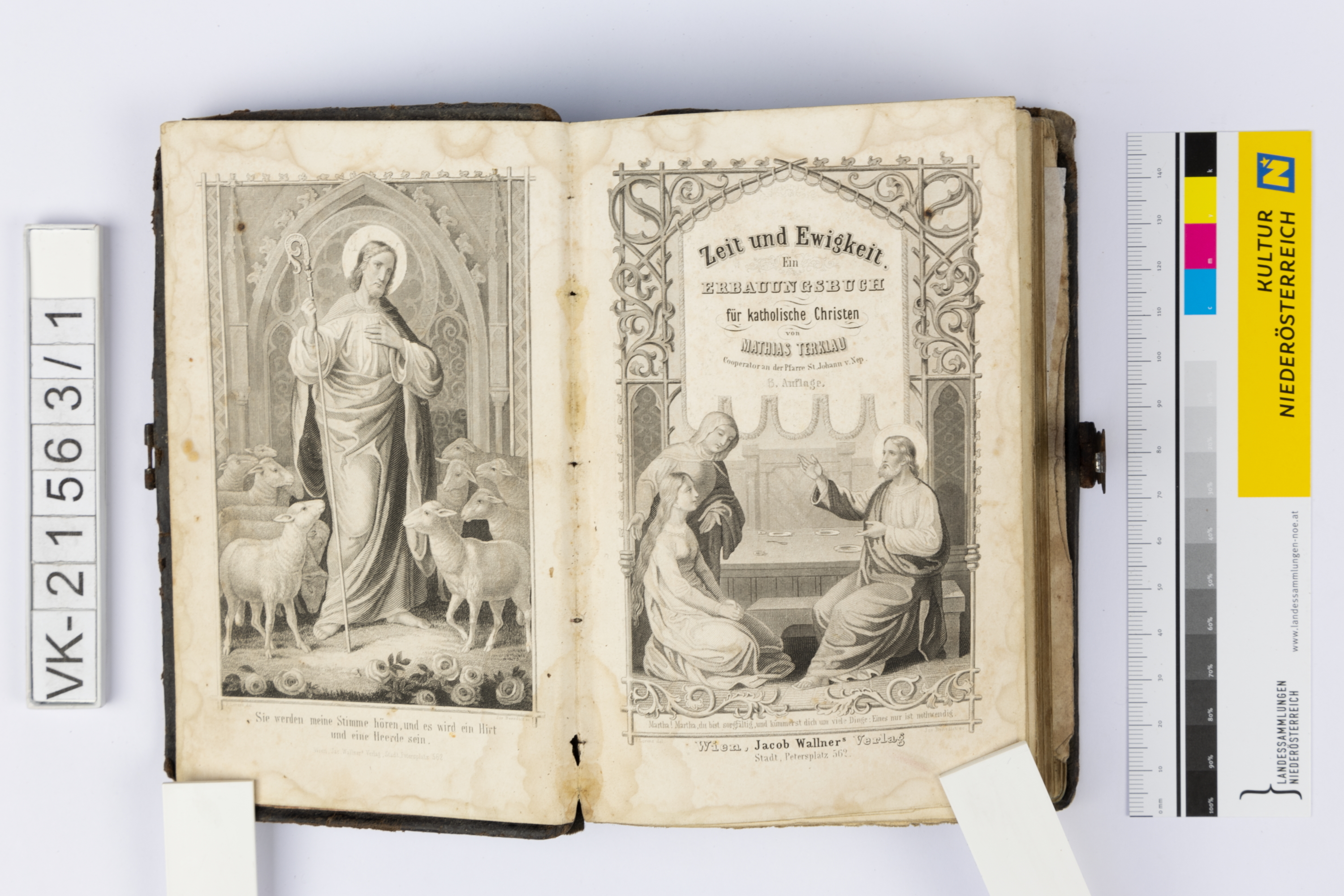 In schwarzes Leder gebundenes Gebetsbuch, der Einband ist mit Zierprägungen und war mit einem eingesetzten Medaillon gestaltet, das Buch hat einen Metallverschluss. Titel: "Zeit und Ewigkeit. Ein ERBAUUNGSBUCH für katholische Christen", 448 Seiten. Das Buch enthält diverse Abbildungen, und verschiedene Einlagen. Im Umschlag ist eine handschriftliche Notiz: "... Mörk".