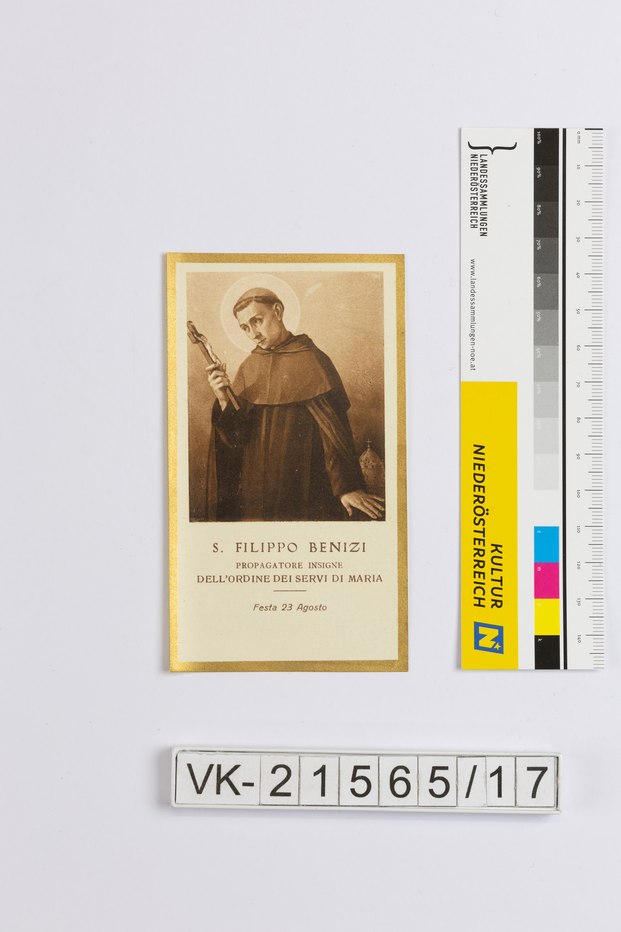 Andachtsbildchen mit Goldrand und Heiligenbild in Sepiatönen: "S. FILIPPO BENIZI PROPAGATORE INSIGNE DEL´ORDINE DEI SERVI DI MARIA".