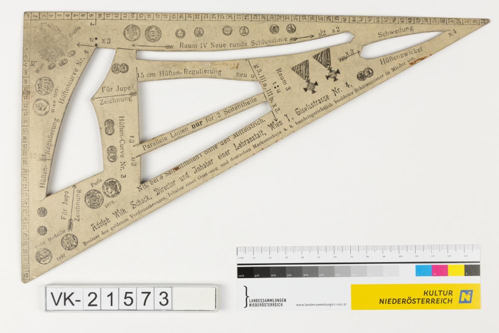 Dreieckiges Lineal mit Durchbrüchen. Das Lineal ist beidseitig bedruckt mit Skalen, diversen Angaben und Markenzeichen sowie Medaillen. Beschriftung: "Centimeter-Dreieck Wiener System Ad. Wilh. Schack", weitere Beschrifungen. Handschriftlich: "Wolfinger Maria". Das Objekt stammt möglicherweise von H. May in Prottes oder von einem Händler in Wien.