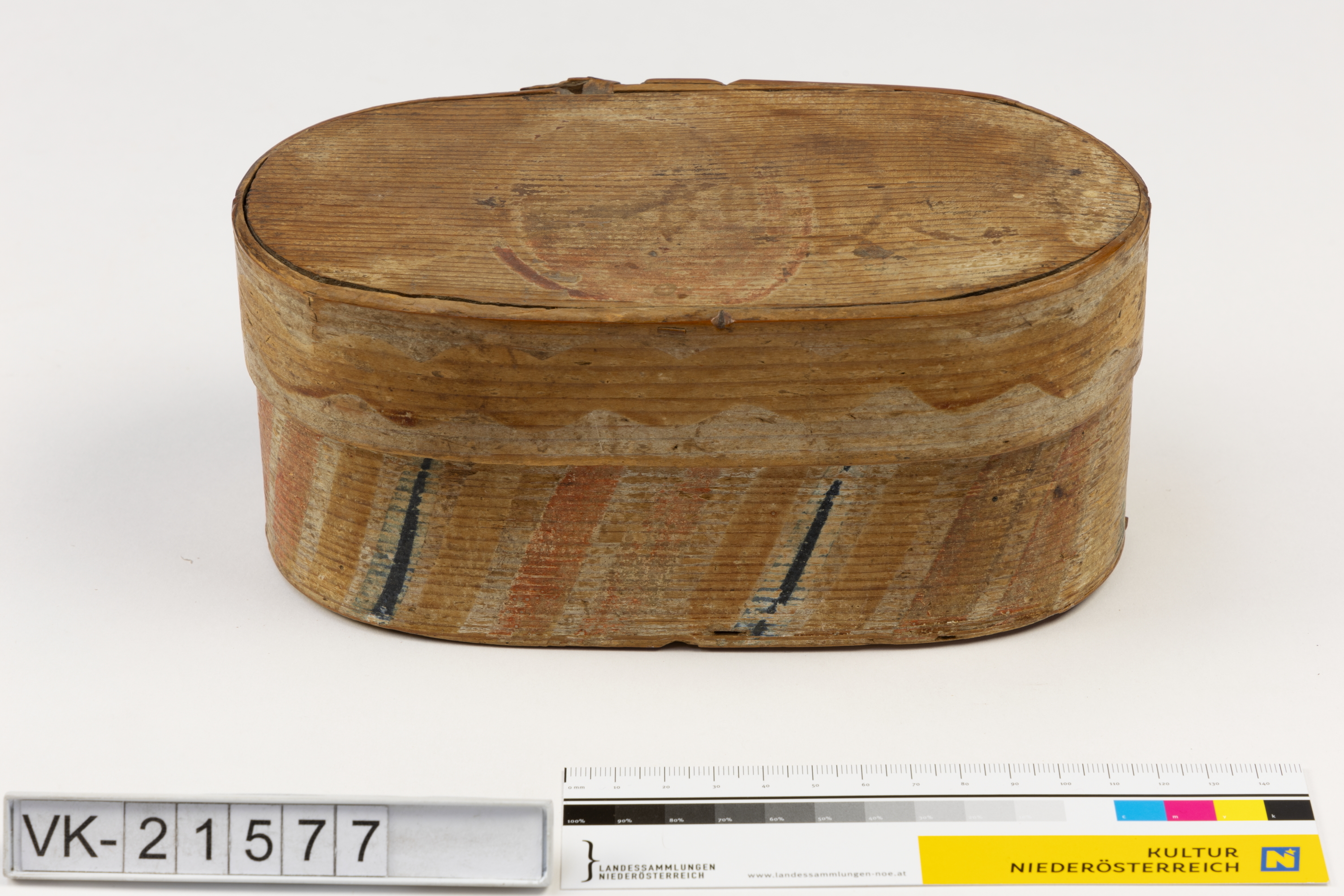 Ovale Spanschachtel (VK-21577a) mit Deckel (VK-21577b), die Schachtel weist Reste einer mehrfärbig gestreiften Bemalung auf.