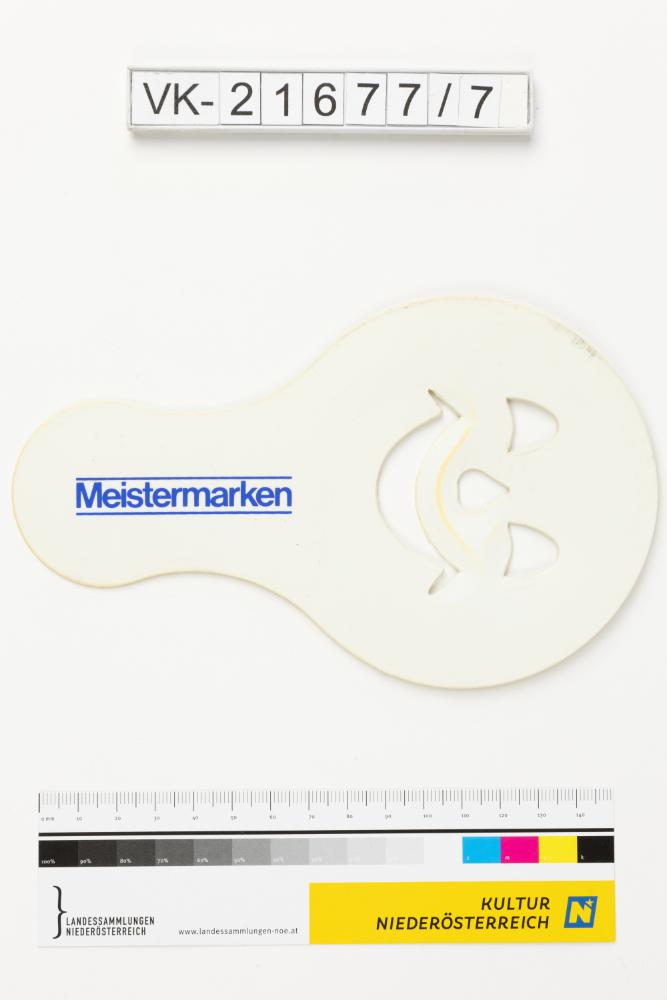 Flache weiße Kunststoffschablone mit Grifflasche, einem Aufdruck: "Meistermarken" und ausgestanzten Elementen eines lachenden Gesichts; zum Bestreuen mit Zucker auf einen Krapfen.