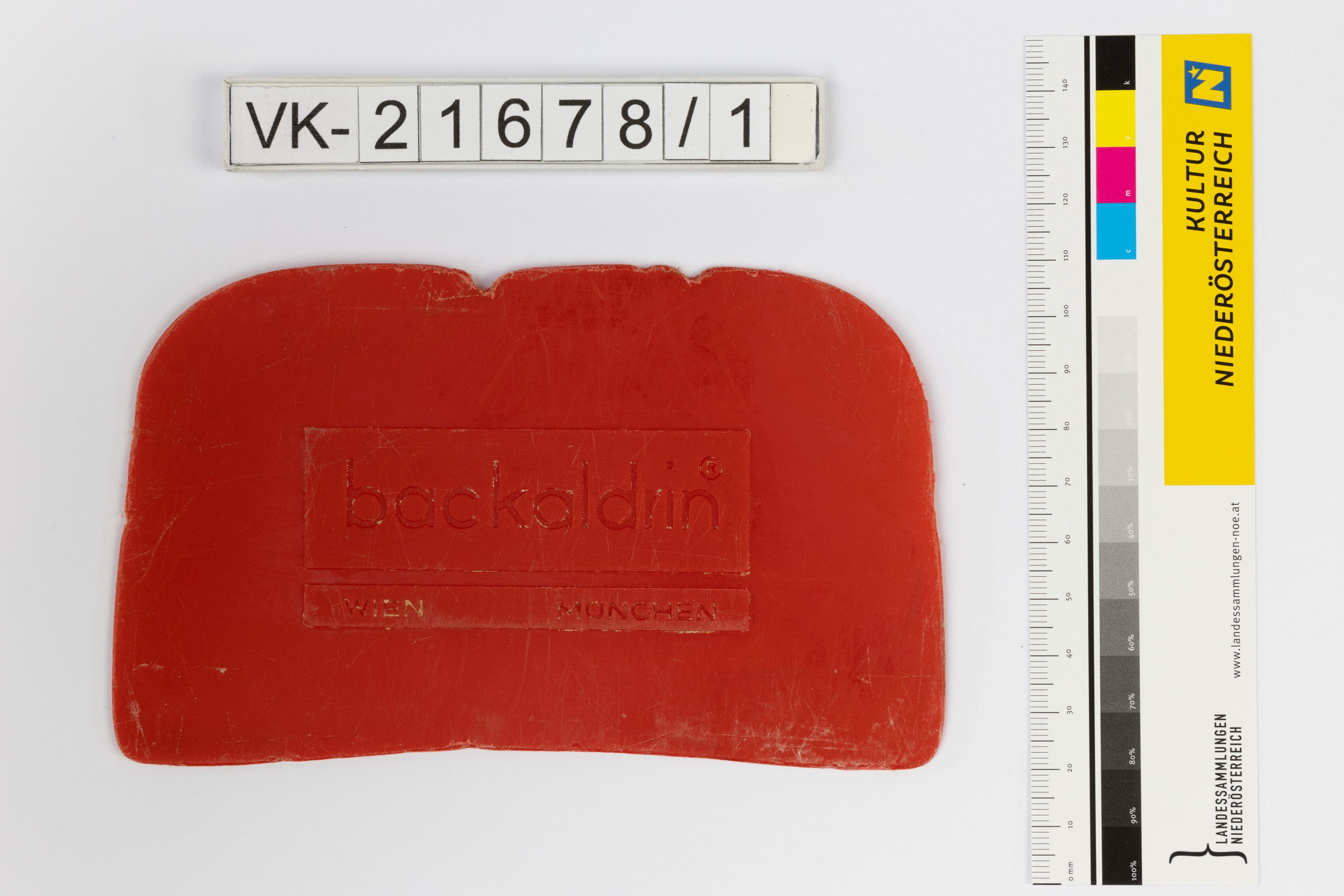 Annähernd rechteckige Teigkarte aus rotem Kunststoff, mit eingeformter Beschriftung: "backaldrin WIEN MÜNCHEN".